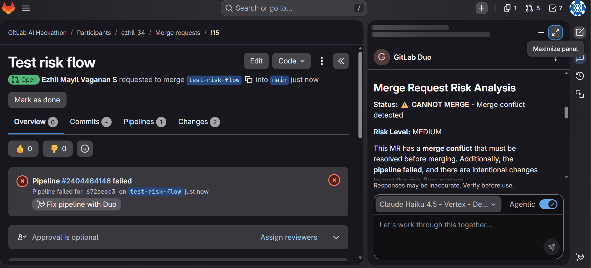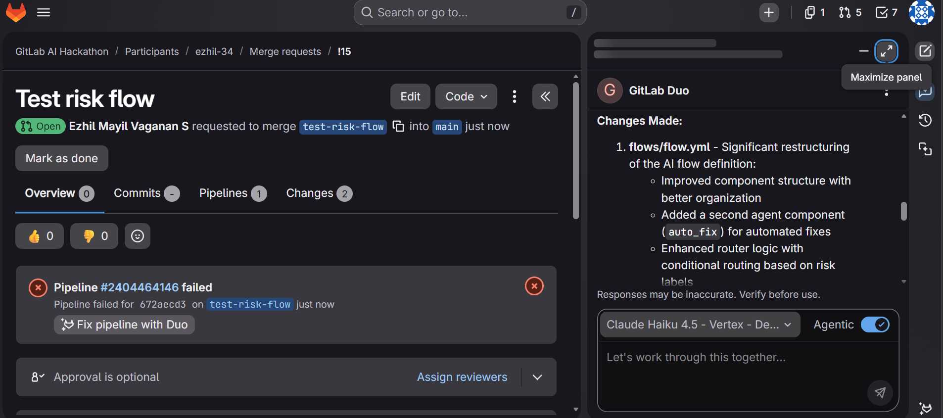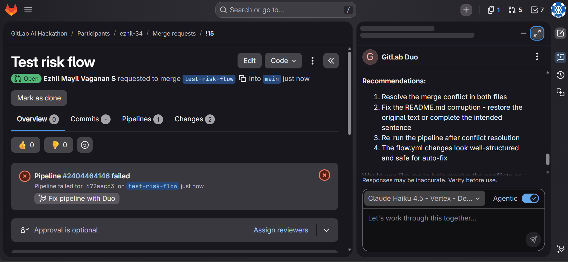 A risk analysis agent evaluates the merge request and assigns a risk level. An auto-fix agent is triggered only for safe cases and applies controlled fixes. All actions—reading files, creating branches, committing changes, and opening merge requests—are done using GitLab’s native tools to ensure reliability and traceability.
