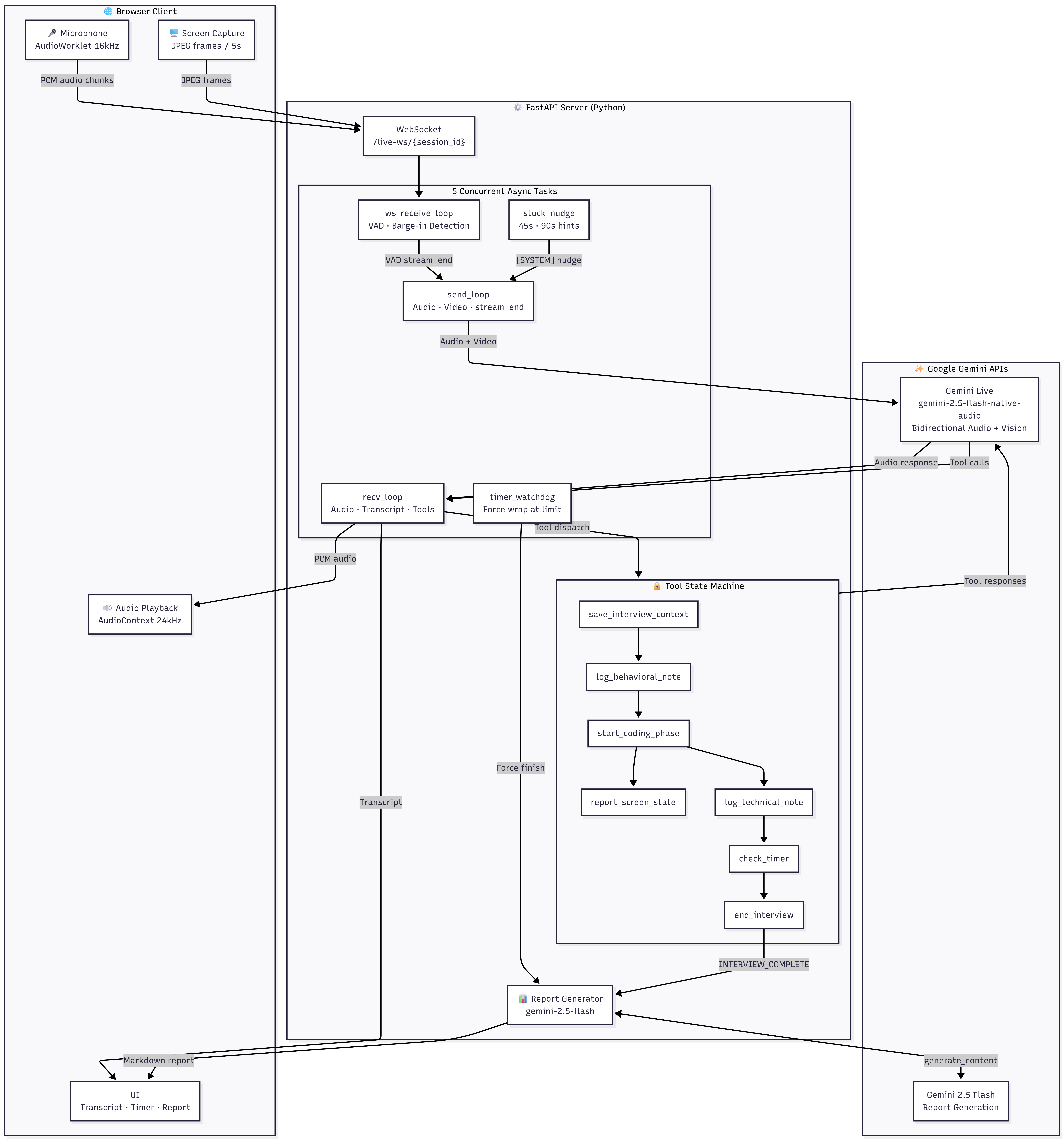 The core is Google Gemini Live for real-time bidirectional audio and vision. The browser captures microphone audio at 16kHz via AudioWorklet and screen frames as JPEG every 5 seconds, both streamed to a FastAPI backend over WebSocket. The backend forwards audio and video to Gemini Live and plays back the AI response at 24kHz. The hardest part was the audio pipeline. Gemini Live requires explicit stream_end signals to know when the user has finished speaking. We built a custom VAD system from scratch - computing RMS energy on every 256ms PCM chunk, detecting sustained silence, applying a cooldown after the AI finishes speaking to prevent echo triggering false stream_ends, and handling barge-in when the candidate speaks over Alex. The second challenge was making the interview follow a reliable structure. A tool-based state machine enforces the correct sequence - concept questions, coding phase, wrap-up - by blocking tool calls that fire out of order and returning error messages so Gemini self-corrects. Five concurrent async tasks per session handle audio sending, audio receiving, VAD, stuck-candidate nudging, and timer watching. The final report is generated by Gemini 2.5 Flash and rendered as markdown in the browser.