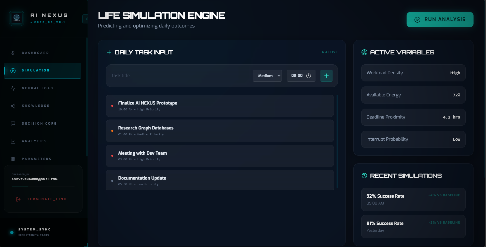 🤖 AI + Logic Integration Combining algorithms + AI reasoning Maintaining system consistency 🎯 User Experience Making complex concepts simple Designing intuitive interfaces 🏆 Accomplishments Built a working AI life management prototype Implemented predictive simulation Designed cognitive load system Created knowledge graph Integrated AI reasoning Developed full-stack system 📚 What We Learned AI can move beyond chat → into decision systems Knowledge graphs model real-life context Predictive systems improve planning Full-stack AI systems require tight integration