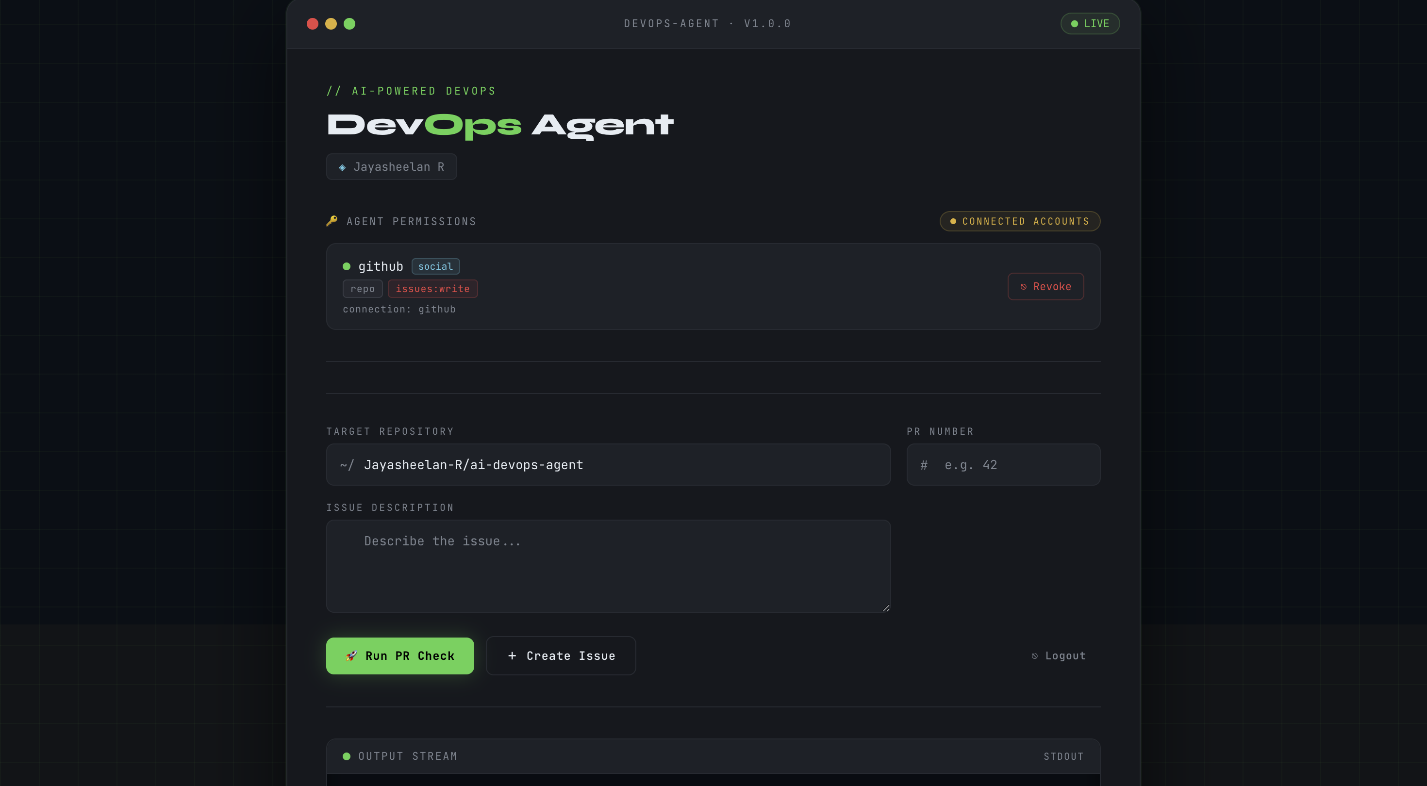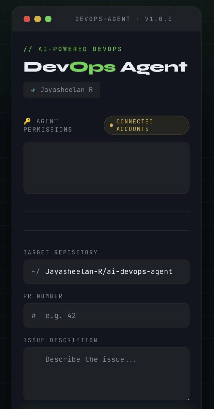 The AI DevOps Agent is a secure DevOps dashboard that lets developers manage GitHub workflows without touching a single API key or OAuth token manually.
