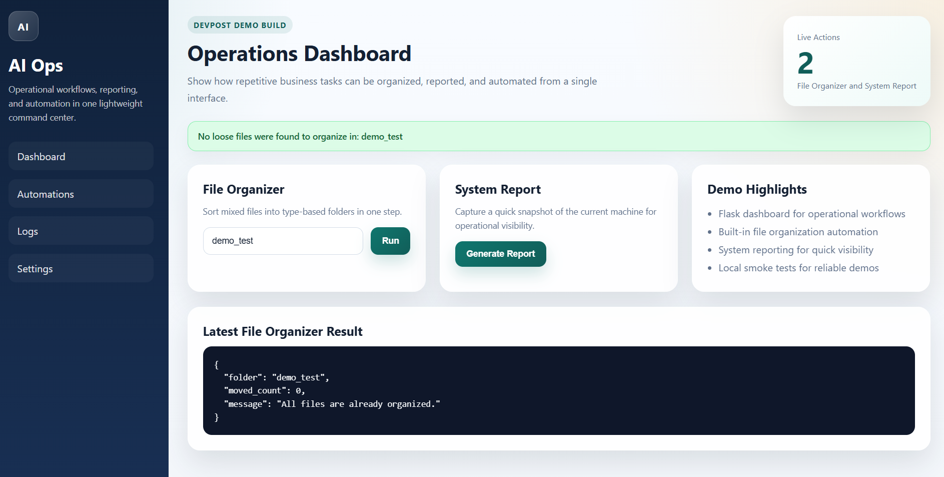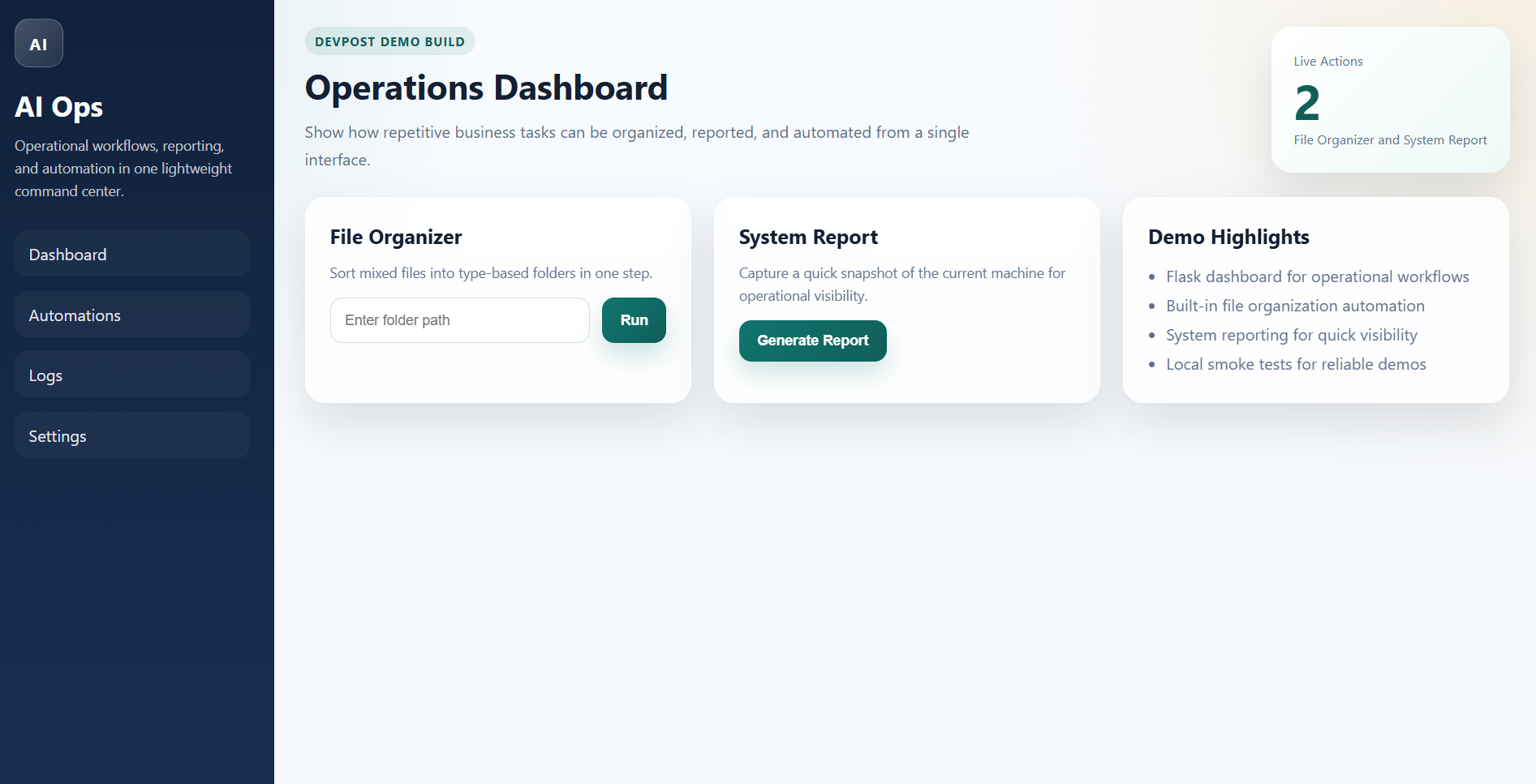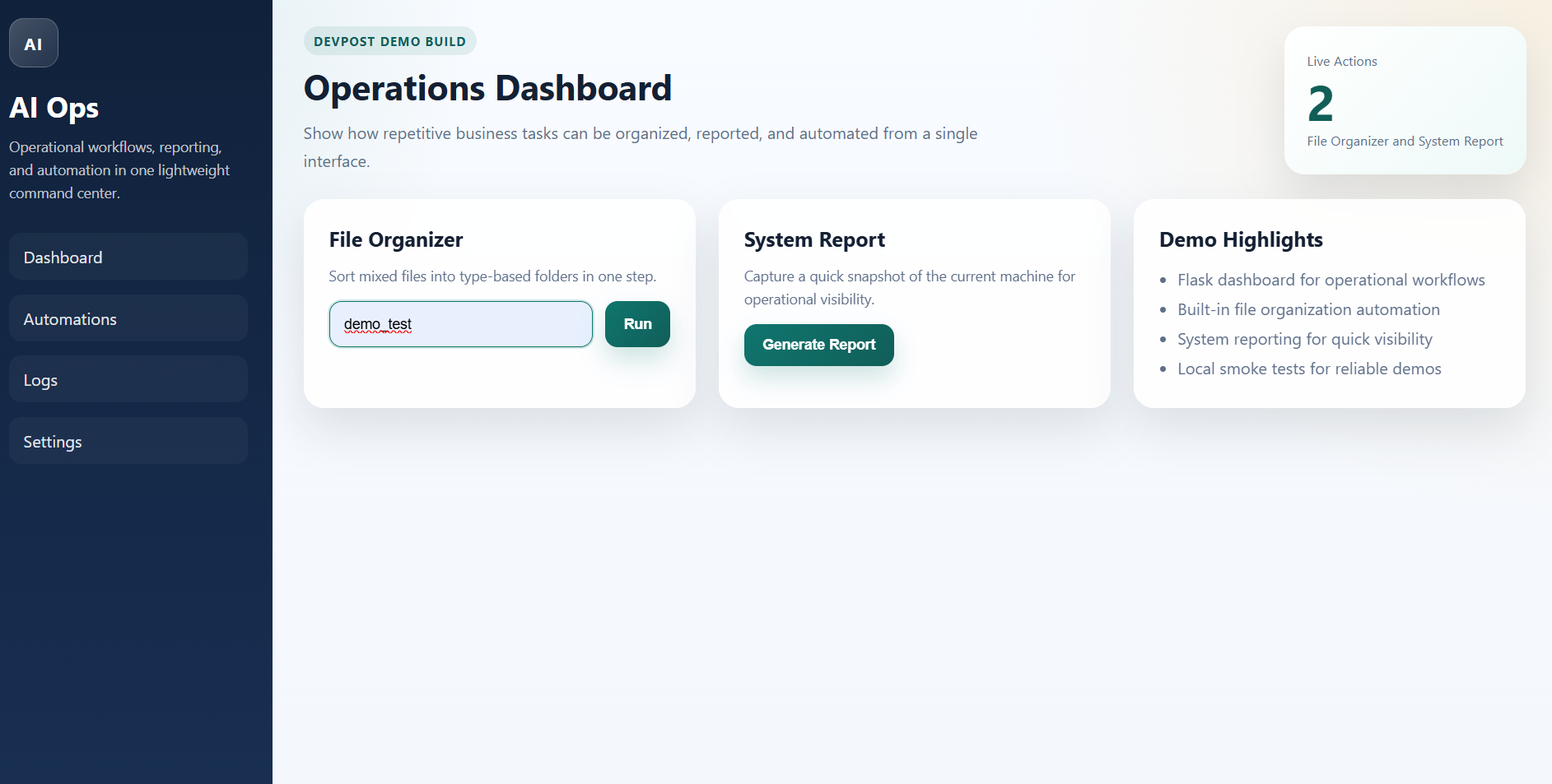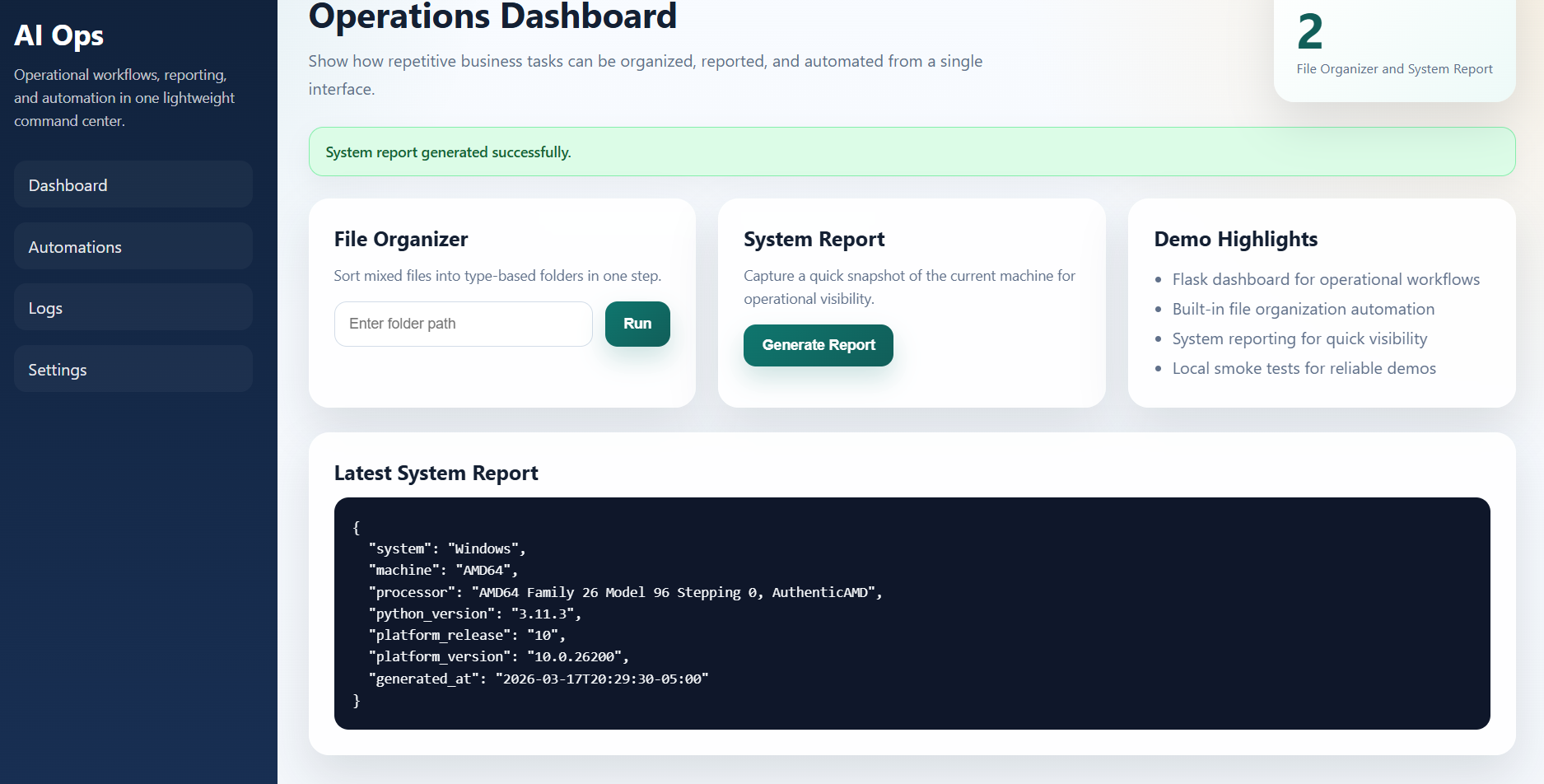 AI Ops Assistant is an intelligent automation dashboard designed to streamline business operations by combining workflow automation, file organization, and real-time system insights into a single interface.