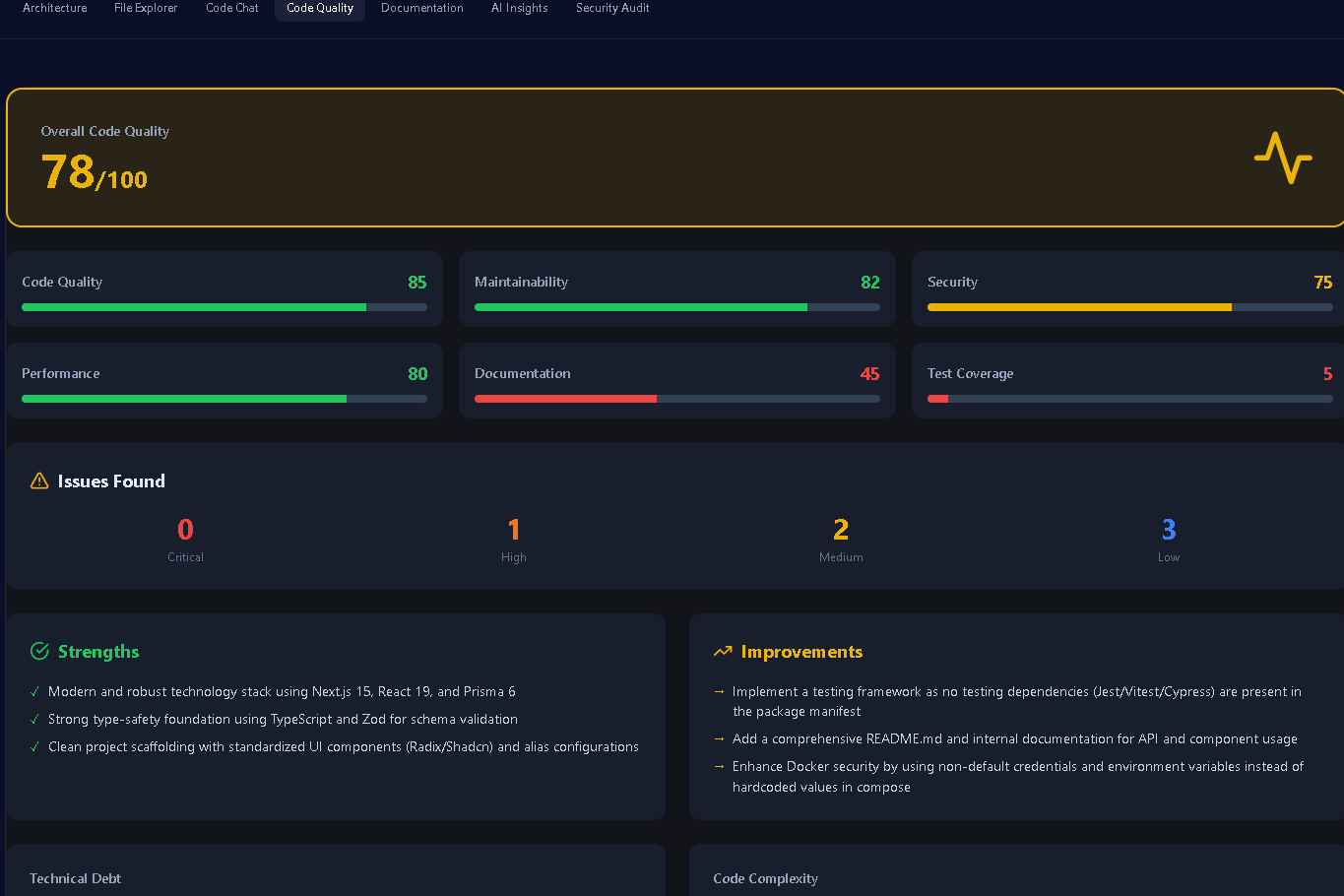 CodeRecon is a comprehensive AI-powered platform that transforms how developers analyze and maintain their code. It acts as an automated senior engineer that provides: