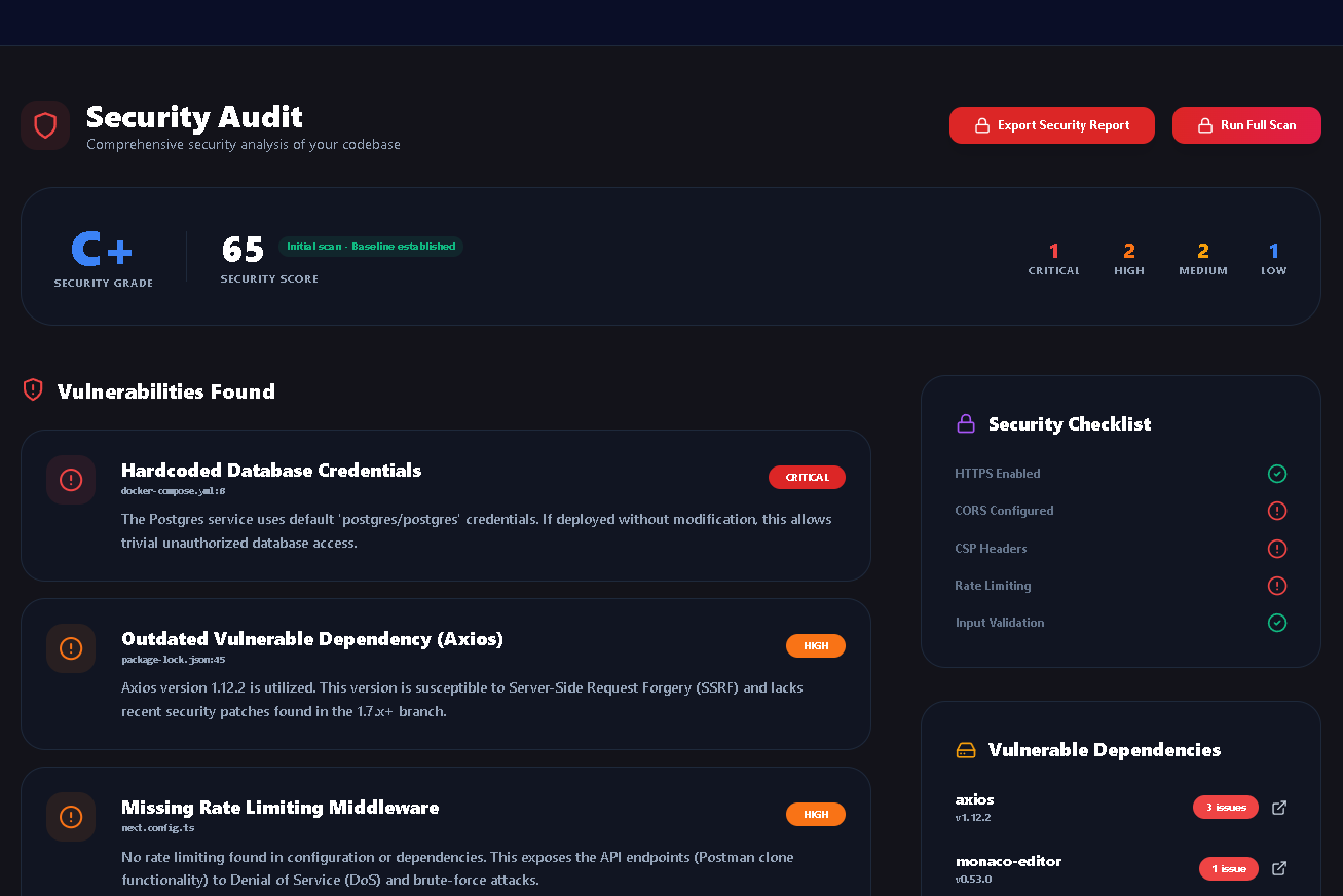 - Security Audits: Scans for vulnerabilities (OWASP Top 10) and security flaws, providing actionable fixes and severity classifications.
