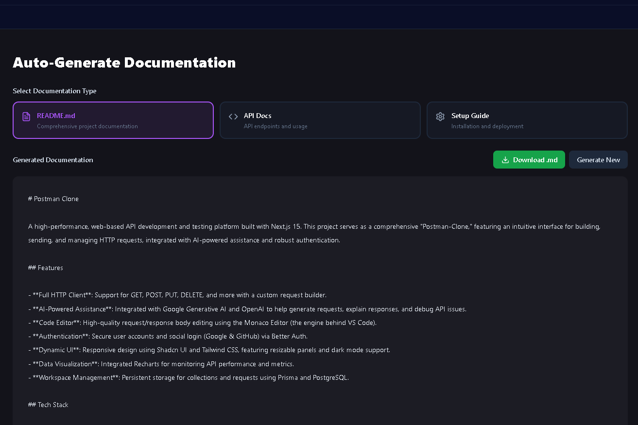 - Automated Documentation: Generates comprehensive documentation, including API specs, READMEs, and inline code comments, saving hours of manual work.