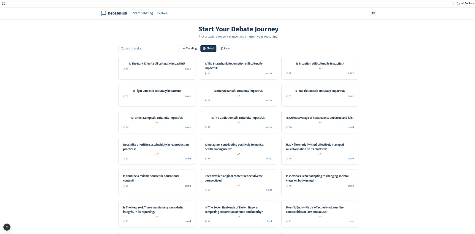 I’ve always been fascinated by the power of live, structured debate to sharpen critical thinking. At the same time, I wanted to explore how AI could both generate engaging topics and judge arguments in real time. Combining trending-topic discovery with a 1 v 1 debate platform felt like the perfect playground to learn about WebSockets, real-time matchmaking, and modern LLM integrations. What it does