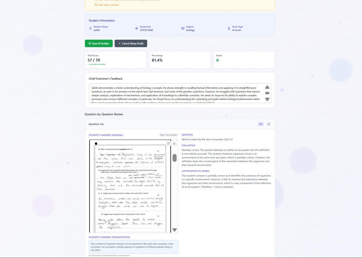 • Consistency: Different subjects and marking schemes demanded prompt engineering plus rule-based normalization to keep partial credit consistent without overfitting to one exam style.