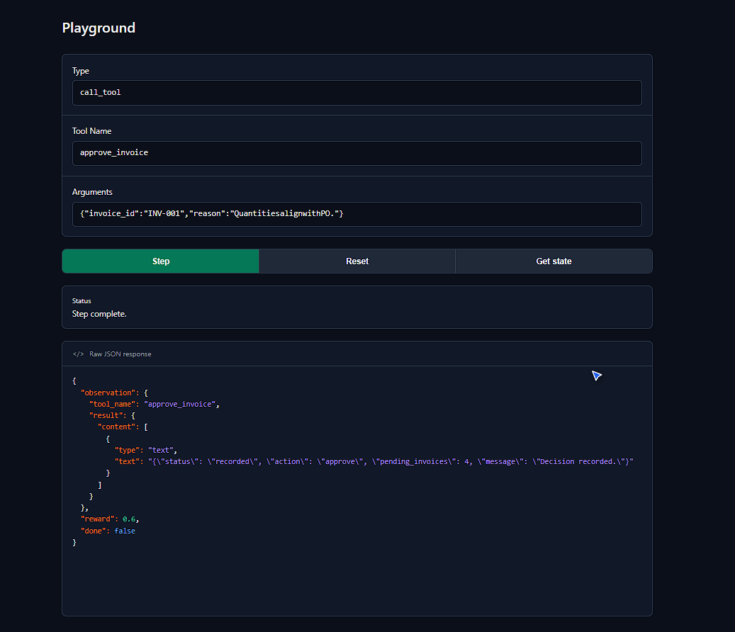 Every action is graded in real time through a reward-based mechanism. Correctly resolving an invoice with solid reasoning earns +1.00. Properly reading the invoice before deciding earns +0.05. Guessing without opening the invoice costs -0.10. And approving a fraudulent or duplicate invoice carries a heavy penalty of -0.50 — ensuring the agent learns not just to complete tasks but to improve its judgment over time.
