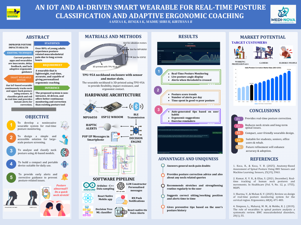 In a world where screens dominate our daily lives, posture has silently become a public health concern. The proposed solution, an AI-powered smart neckband detects, analyses, and corrects neck and spinal posture in real-time using embedded IMU sensors and a self-learning AI engine. Unlike static wearables, this system adapts to the user’s body dynamics, providing subtle haptic alerts and personalized exercises through a mobile dashboard. It’s not just a tracker, it’s a digital posture companion that learns, predicts, and coaches for lasting musculoskeletal wellness.