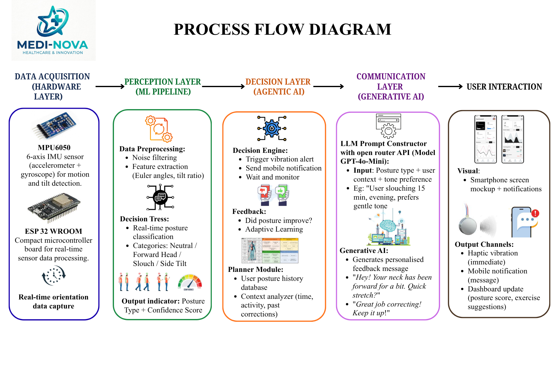 At the hardware level, we developed a lightweight smart neckband using an ESP32-WROOM microcontroller interfaced with an MPU6050 6-axis IMU sensor to continuously capture neck orientation data (pitch, roll, yaw). The raw sensor data is preprocessed on-device using noise filtering and trigonometric transformations to extract meaningful posture features.