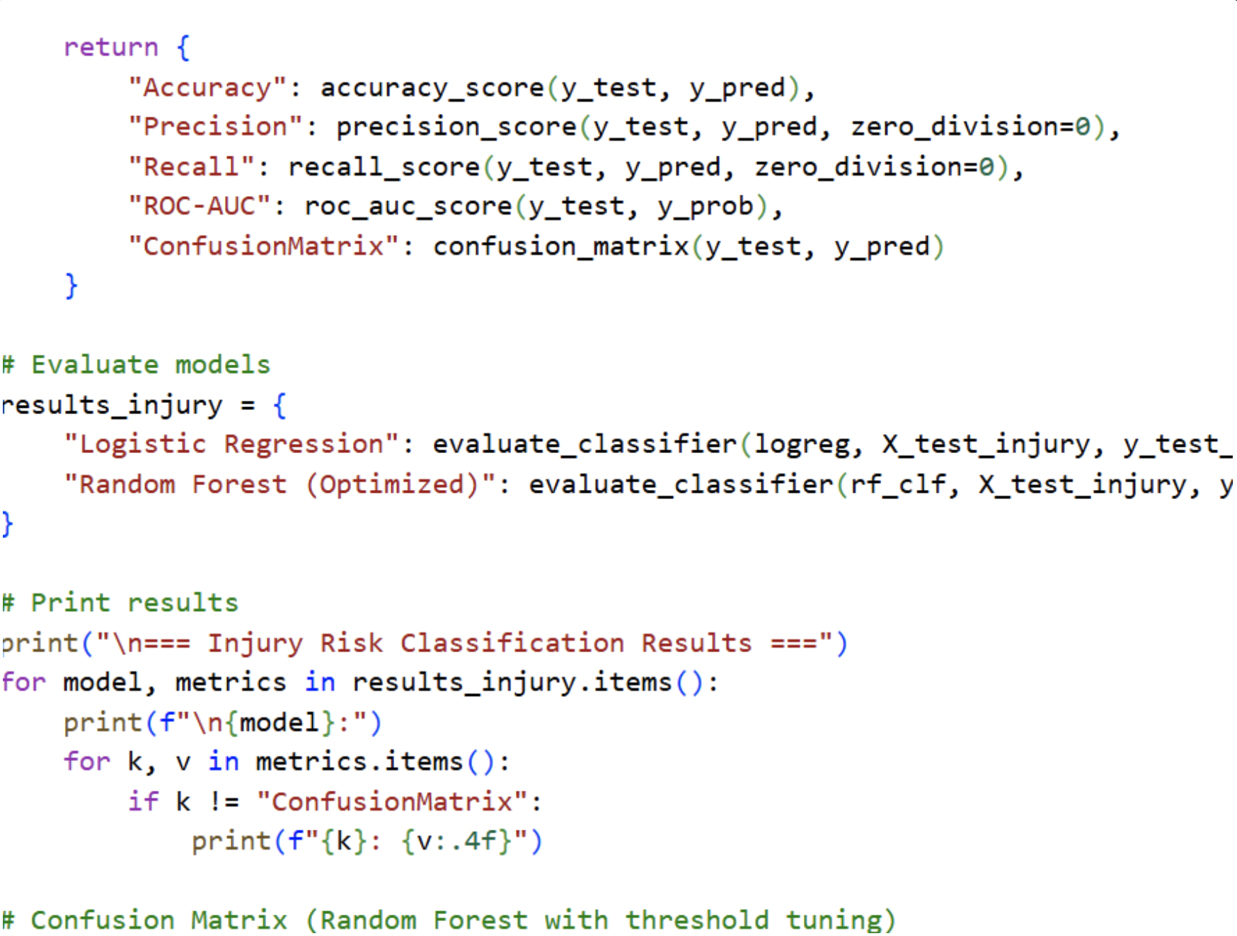 I then leveraged Python to perform advanced data analysis, generate plots and graphs, and visualize correlations between player performance and injury risk. Using these insights, I implemented machine learning algorithms to predict both ACL injury risk and estimated recovery duration. Every day of the hackathon involved iterative testing of the models, adjusting for accuracy, precision, and interpretability. I continually refined the outputs to make them clinically meaningful and actionable for athletes and coaches.