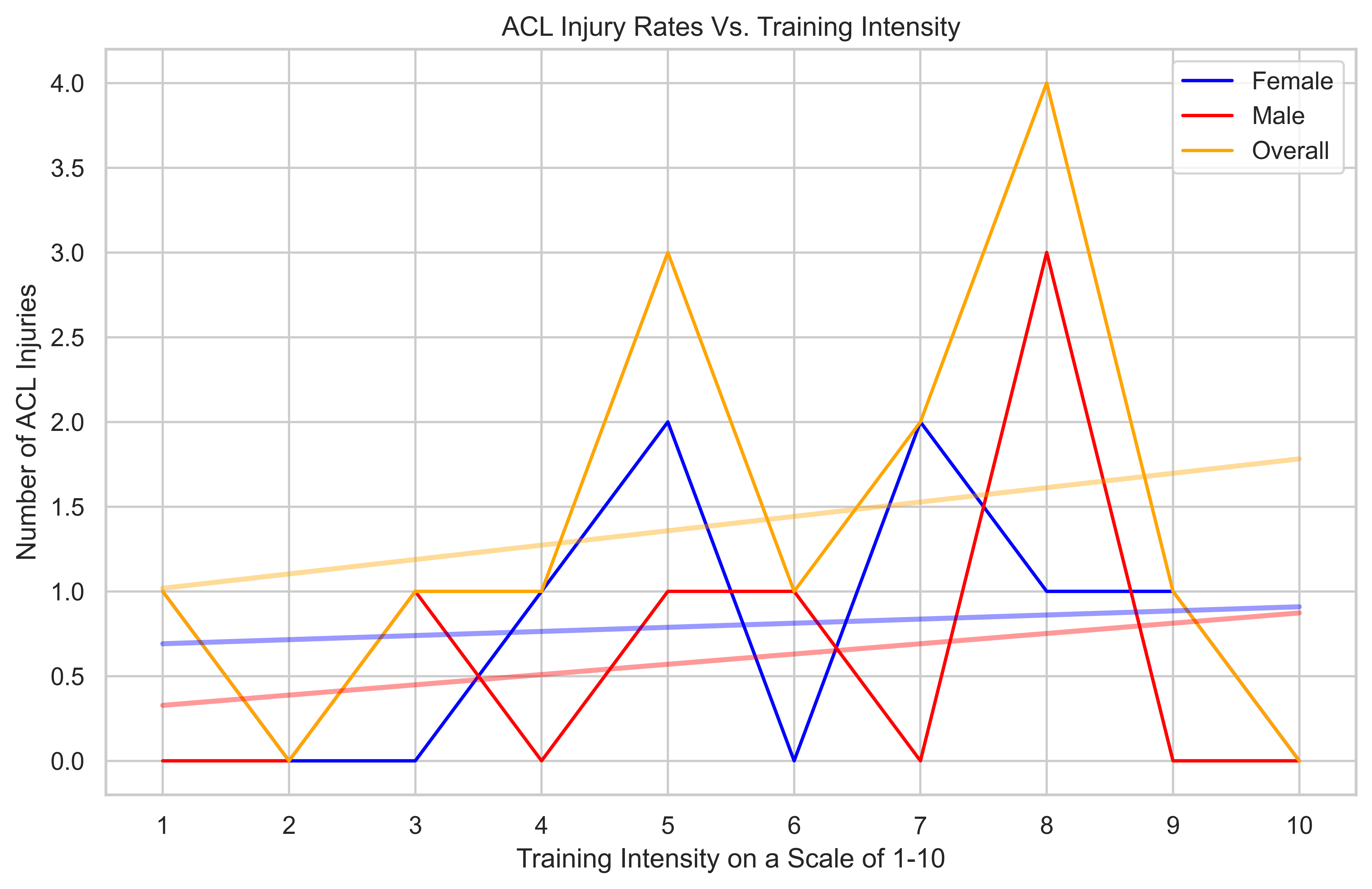 Example of Python Plotting (Line Graph - ACL Injury Rates Vs. Training Intensity)