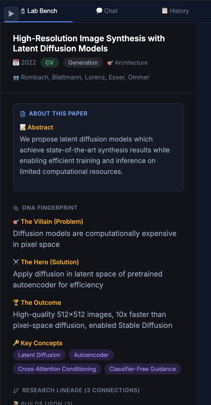 - Multimodal DNA Extraction: Using Gemini 1.5 Pro's multimodal capabilities, it doesn't just read the text; it analyzes figures, tables, and architectural diagrams to extract a "DNA Fingerprint." This identifies the core problem ("The Villain") and the proposed solution ("The Hero") with full visual context.