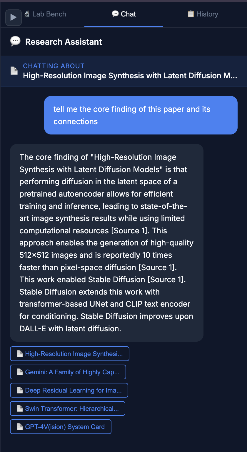 - Context-Aware Chat: You can interrogate your entire library. Ask "How does FlashAttention optimize the Transformer?" and get an answer synthesized from the specific papers in your graph.