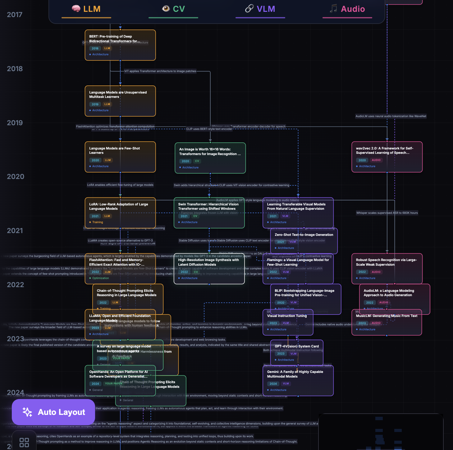 - Genealogy Mapping: It visualizes citations and relationships, showing you how ideas evolved from 2017's Transformers to today's Multimodal giants.