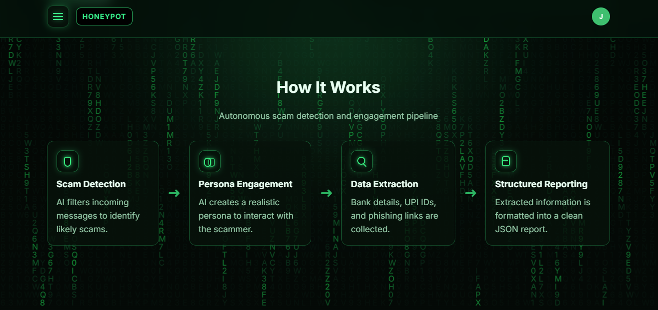 Scam messages are escalating across SMS, WhatsApp, and email. We wanted a safer way to study scam behavior without putting users at risk, so we built an AI honeypot that can engage scammers and extract actionable signals.