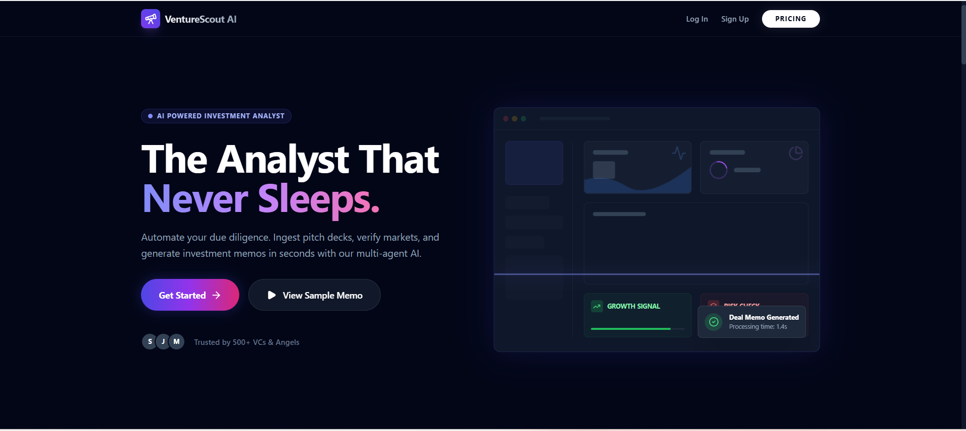 VentureScout AI is an AI-powered platform that ingests unstructured startup materials (PDFs, call transcripts, emails) and synthesizes them into actionable investment insights. It provides a 0-100 Institutional Scorecard, forensic risk detection, and real-time competitive mapping using Google Search Grounding to ensure every claim is backed by current 2025 market data. It doesn't just summarize; it audits.