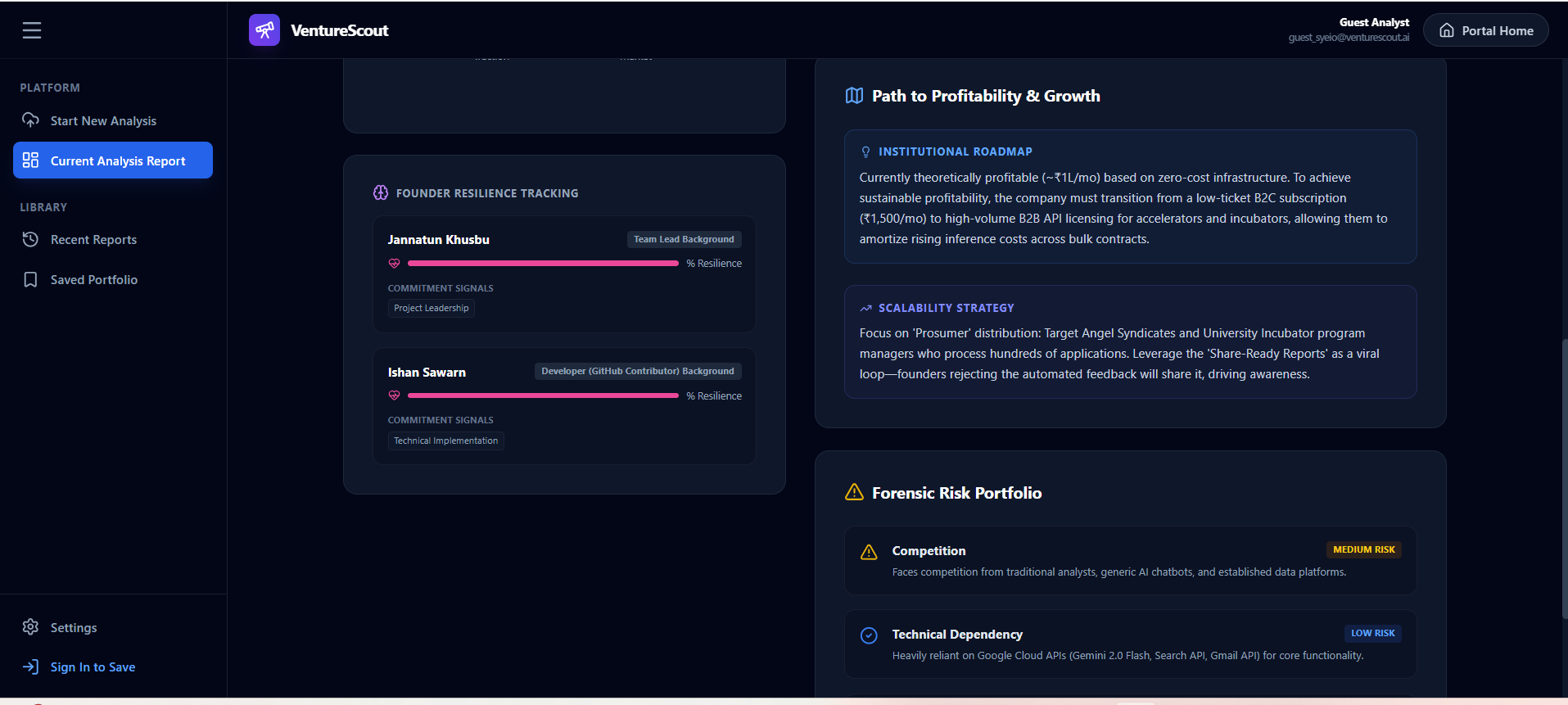 The venture capital landscape is a chaotic "data room" mess. Analysts spend thousands of hours manually cross-referencing pitch decks, verifying LinkedIn profiles, and mapping competitive landscapes. We were inspired to build VentureScout AI—an institutional-grade analyst that uses a specialized multi-agent swarm to perform deep-tissue due diligence at 100x speed. We wanted to bridge the gap between "gut feeling" and "data-driven" investing.