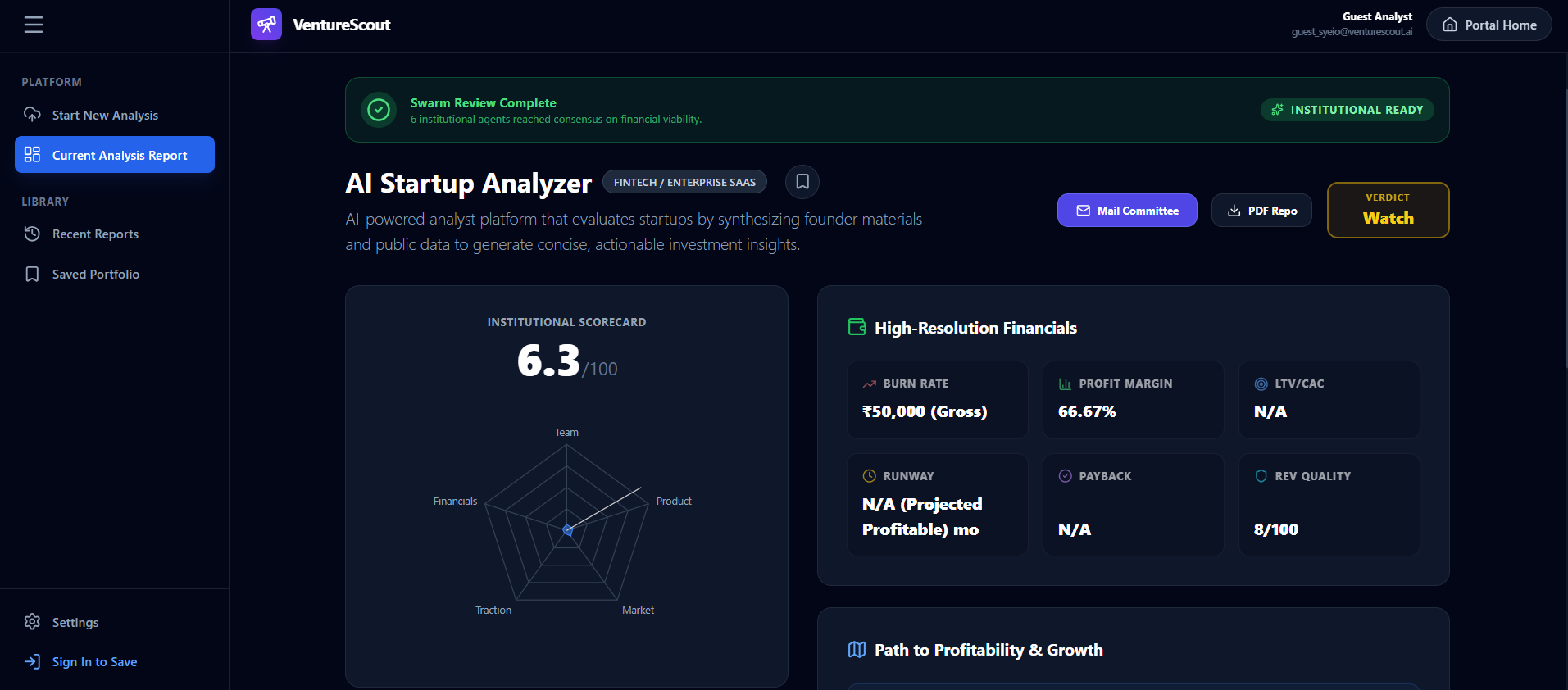 - The Managing Partner: The final reasoning layer that weighs the consensus of the swarm to provide an "Invest," "Watch," or "Pass" verdict. The frontend is built with React 19 and Tailwind CSS, featuring a high-conviction dark aesthetic.