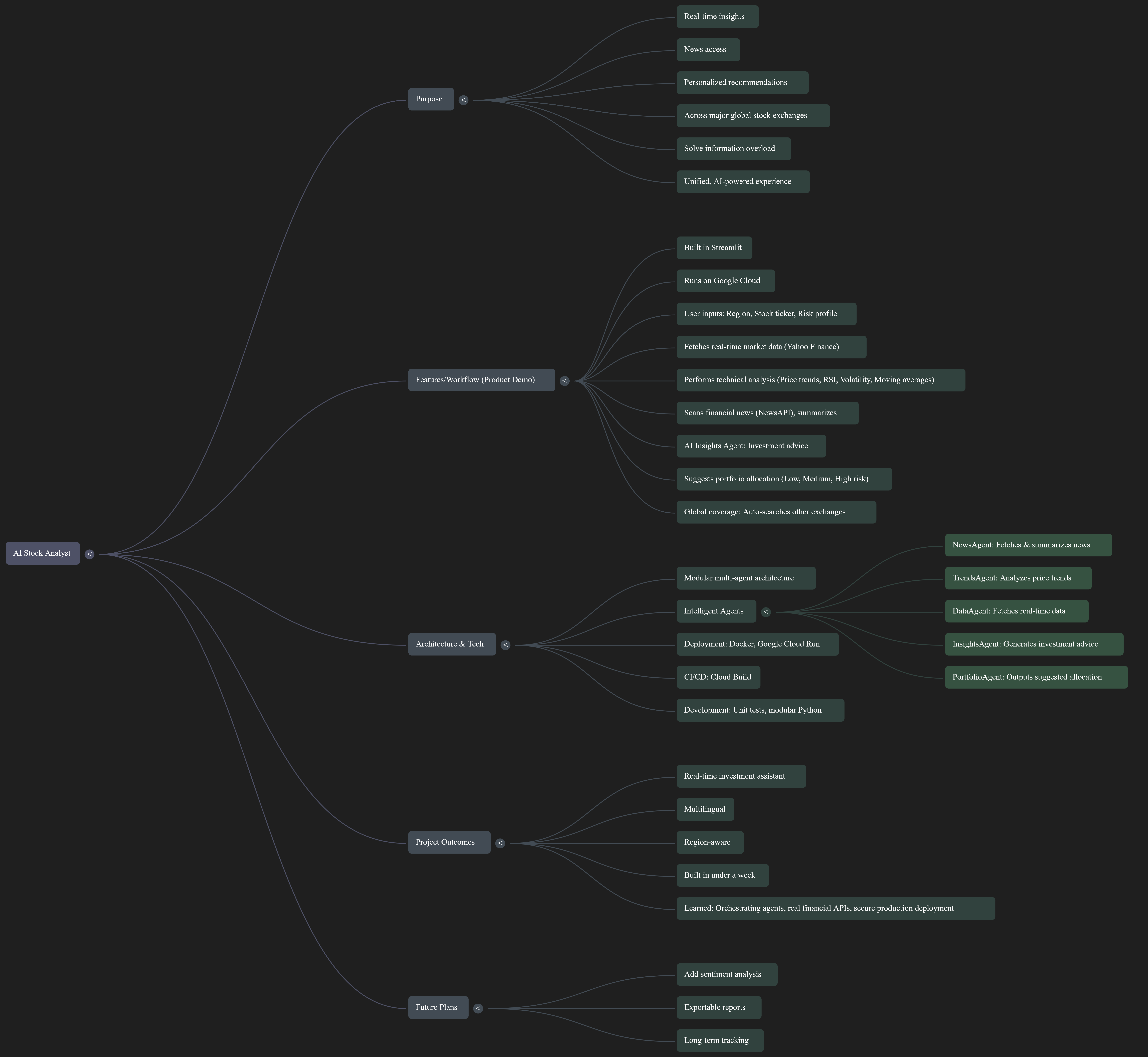 🏅 Accomplishments that we’re proud of • Built a globally aware stock analyzer with intelligent region detection • Designed a modular agent system with real-time decision-making • Delivered clean, readable AI investment guidance from structured and unstructured data • Streamlined the end-to-end deployment pipeline using GCP tooling • Created a UI that’s both data-rich and beginner-friendly
