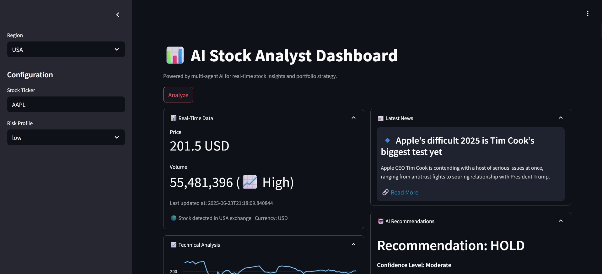 We built a multi-agent system powered by Python and Streamlit, orchestrated by a core StockOrchestrator that manages five specialized agents: • NewsAgent (NewsAPI): Retrieves and formats real-time news based on ticker and region • TrendsAgent: Analyzes technical indicators like RSI, price trends, and volatility • DataAgent (Yahoo Finance): Fetches real-time stock data and performs region fallback • InsightsAgent: Uses LLMs to provide AI-generated investment commentary • PortfolioAdvisor: Creates allocation plans based on user risk profiles