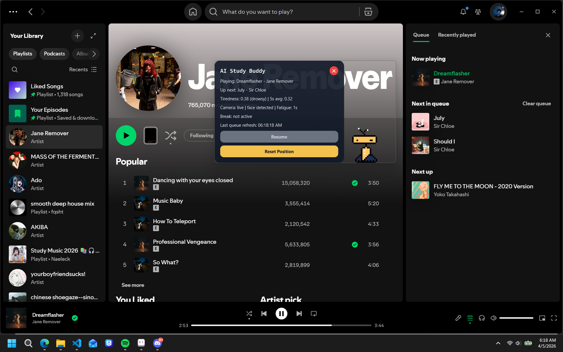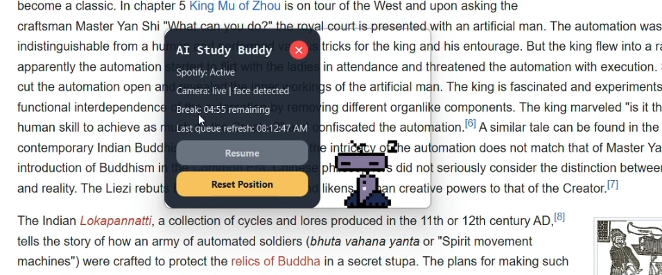 It's a cute little robot buddy that sits on your screen, and you can drag it around wherever you want. It regularly pulls webcam data through a fine-tuned YOLO model to detect drowsiness/focus level on a scale of 0-1 through facial features, and then periodically tells a song ranking algorithm to find a song that matches the current level (through audio features like energy, valence, and tempo) and add it to the queue.