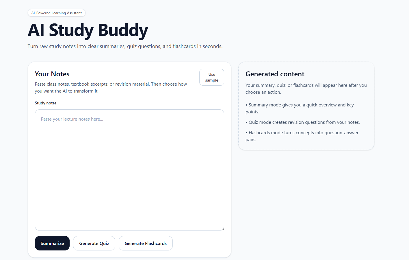 The idea behind AI Study Buddy was to create a simple tool where students can paste their notes and instantly generate structured learning content to help them review faster.