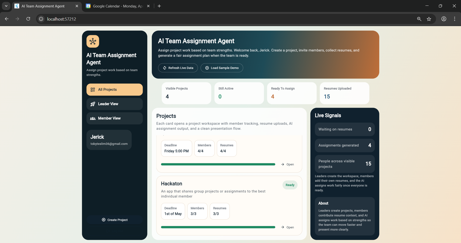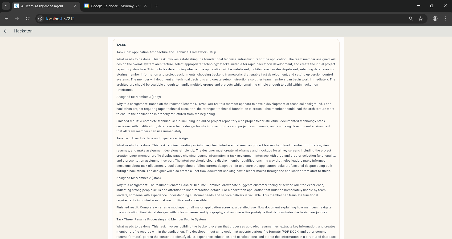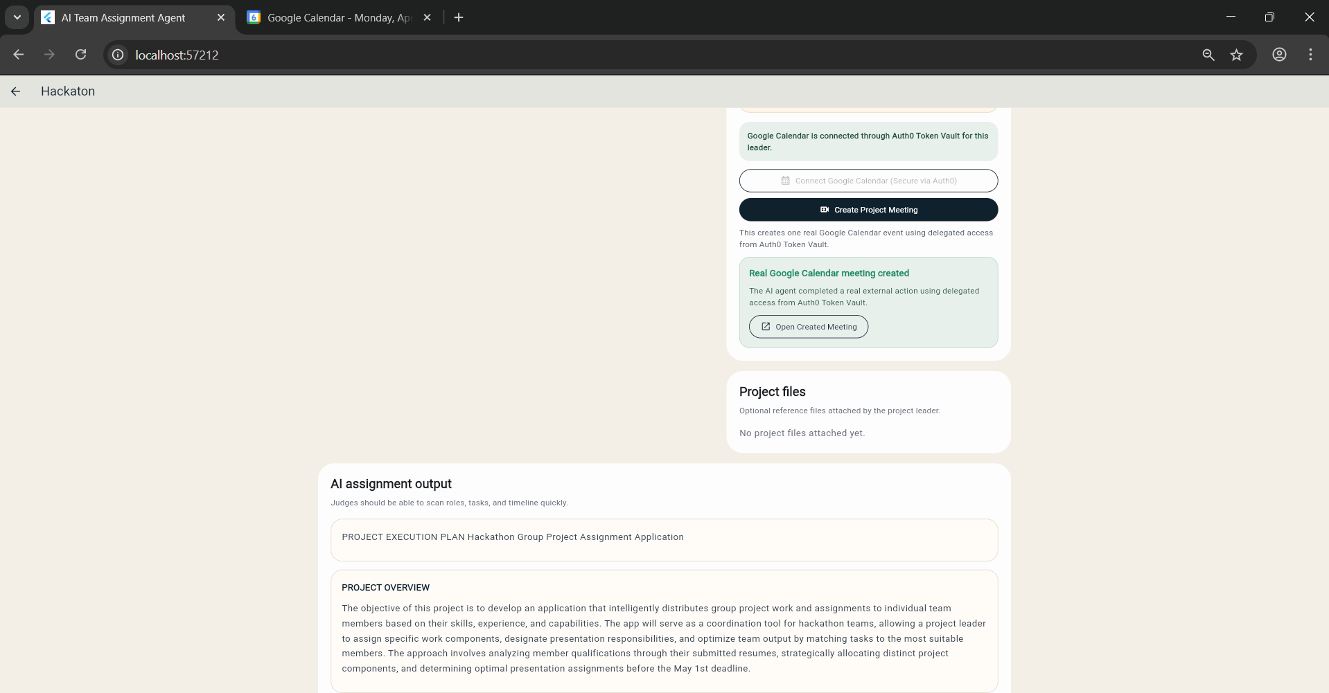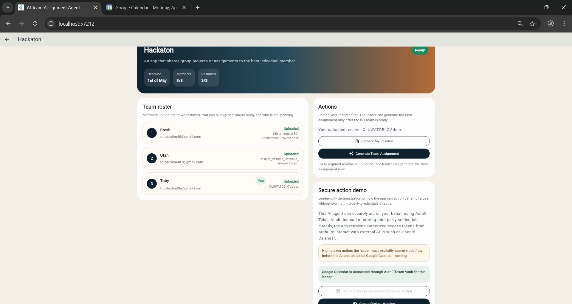 I built the AI Team Assignment Agent to solve that. The app helps a leader create a project, invite teammates, collect individual resumes, and generate a structured assignment plan based on each member’s strengths. I then extended that workflow with a secure real-world action: after the leader explicitly approves it, the app can create a real Google Calendar meeting on the leader’s behalf using Auth0 for AI Agents Token Vault.