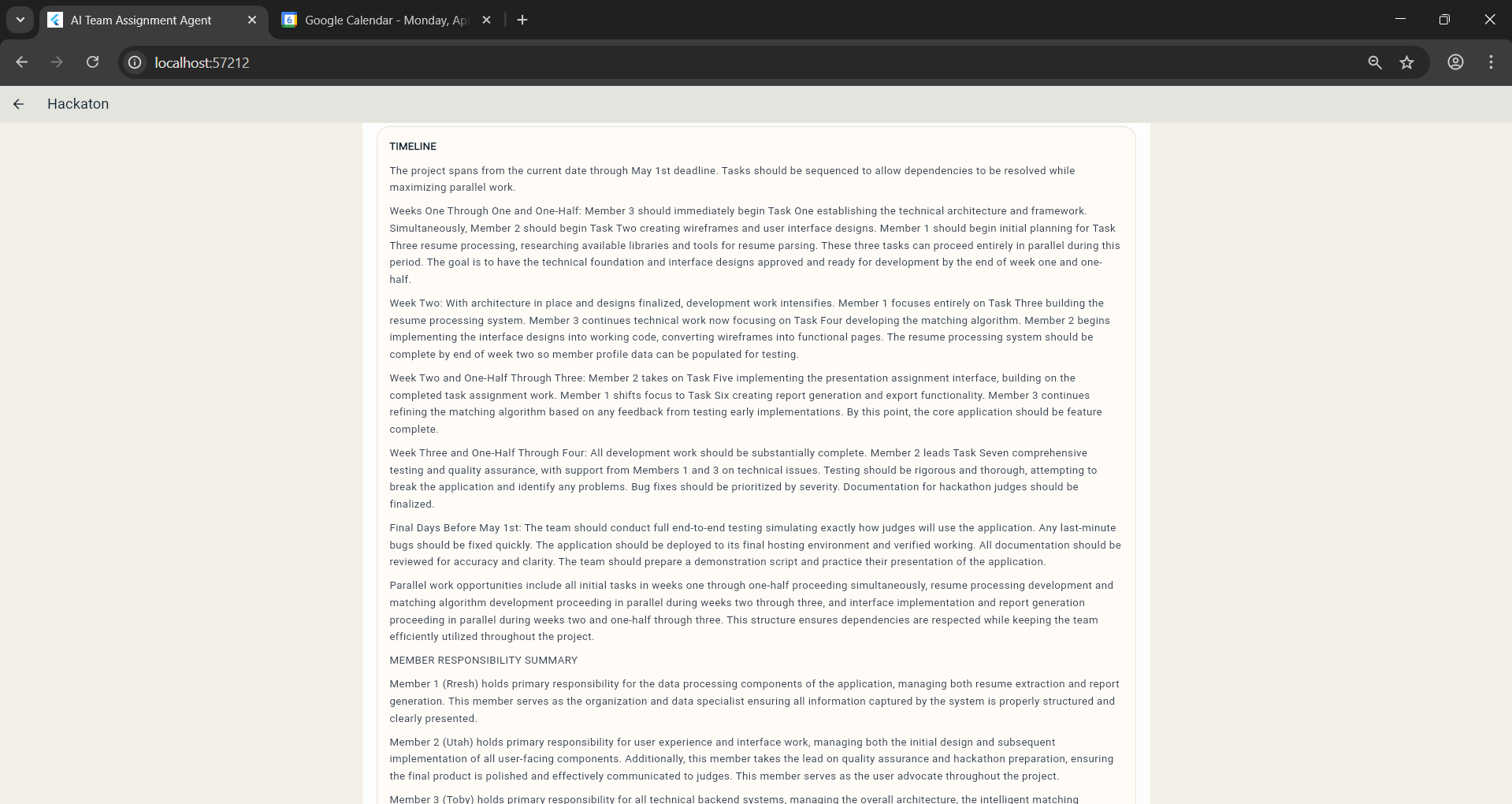 - The app presents a structured output with role assignments, task breakdown, and timeline.