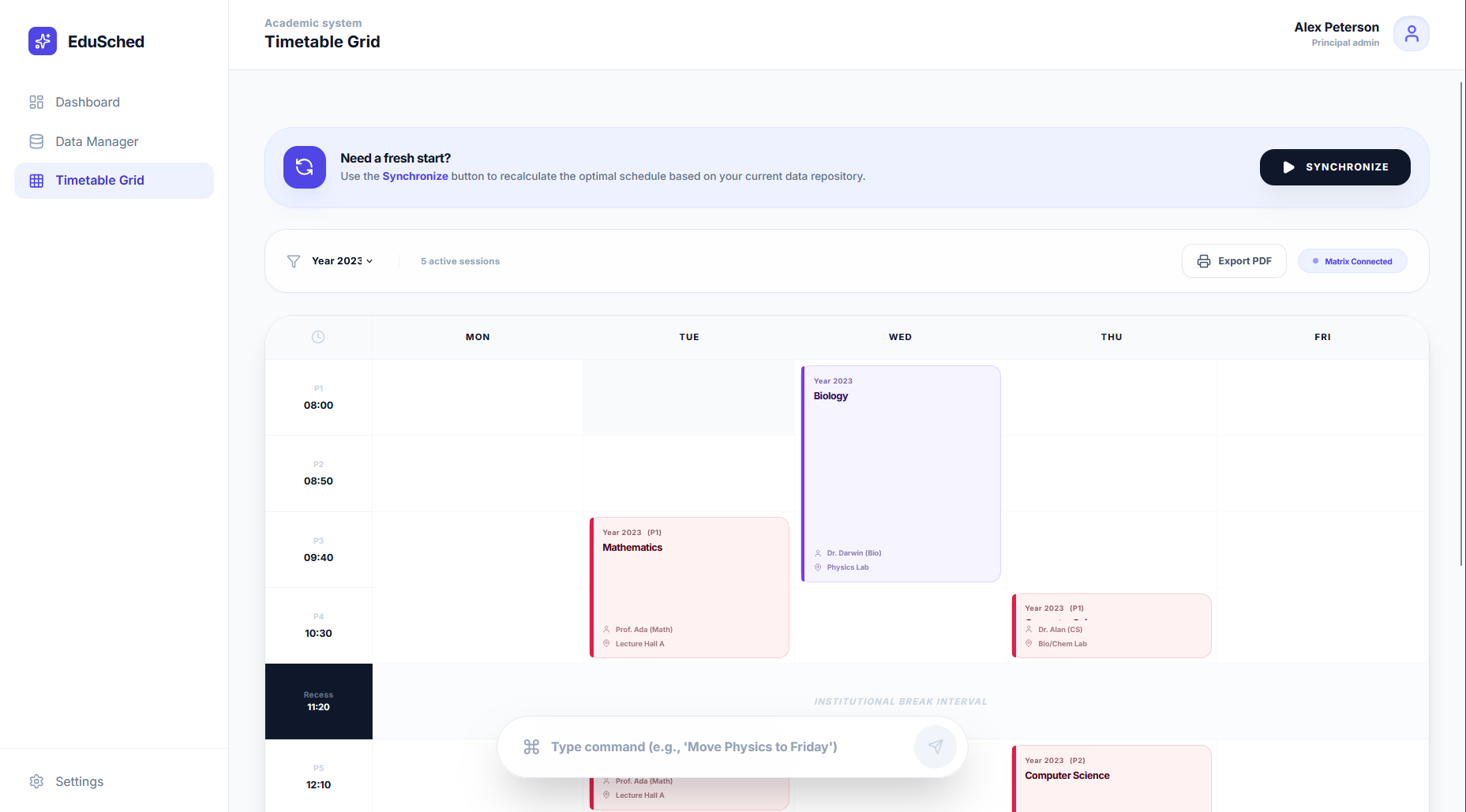 The AI interprets these instructions, updates the scheduling constraints, and regenerates a valid timetable instantly.