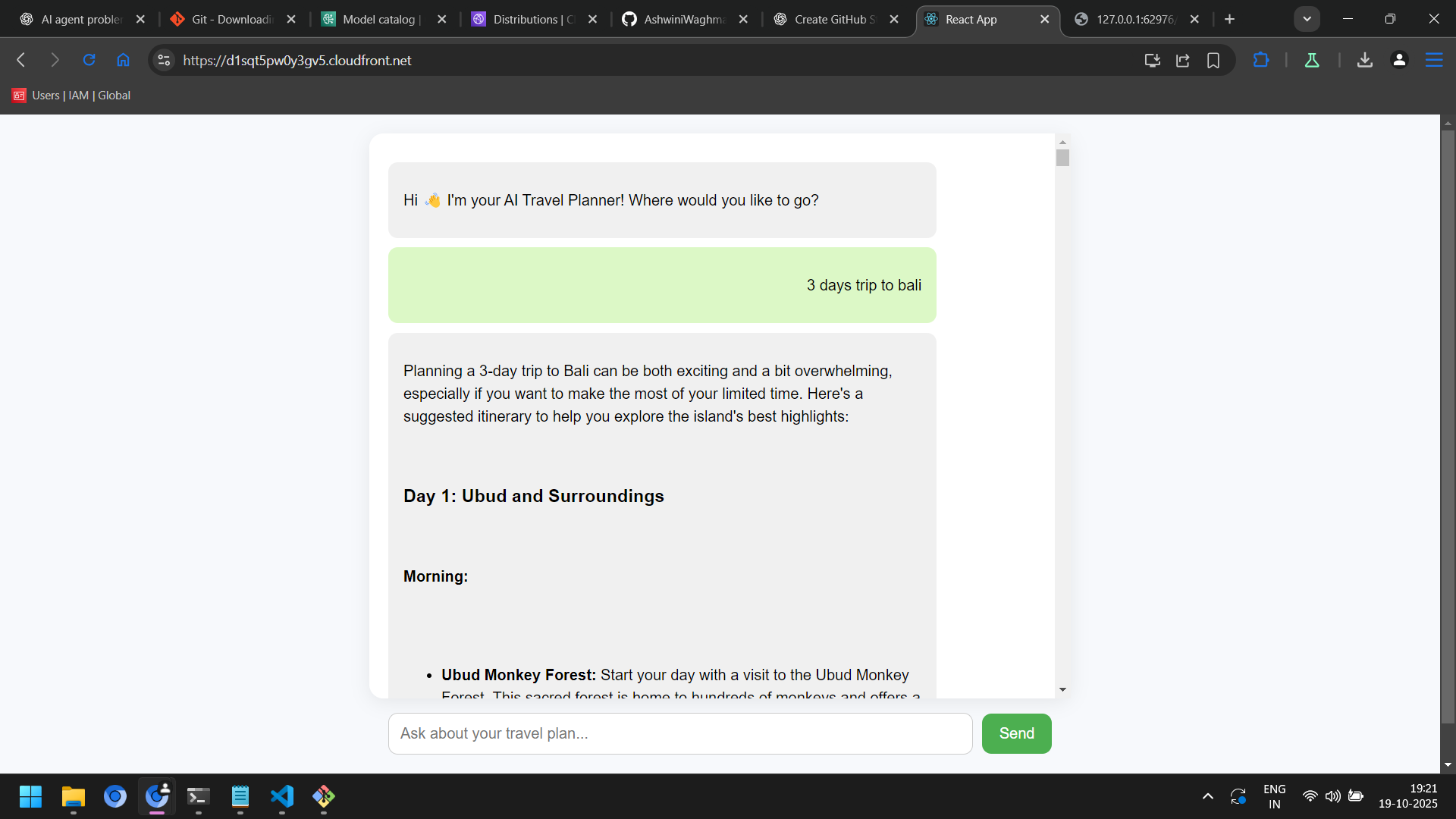 Users simply type their trip preferences, and the AI produces a full, structured itinerary in response.