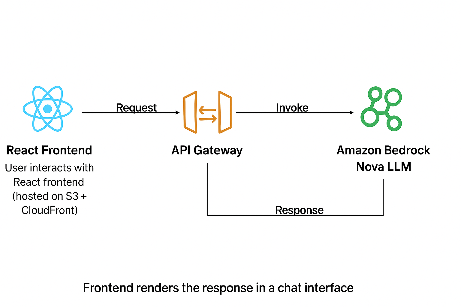 - Lambda formats user input and calls Amazon Bedrock Nova LLM, parses responses, and sends them back to the frontend.