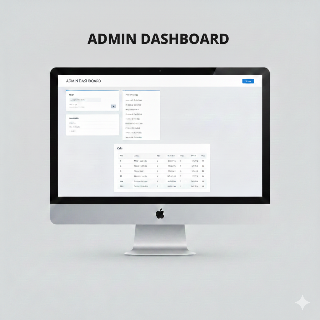 The admin panel supports multi-client management with per-number AI personality, custom greetings, call routing rules, and usage tracking with minute limits per tier.