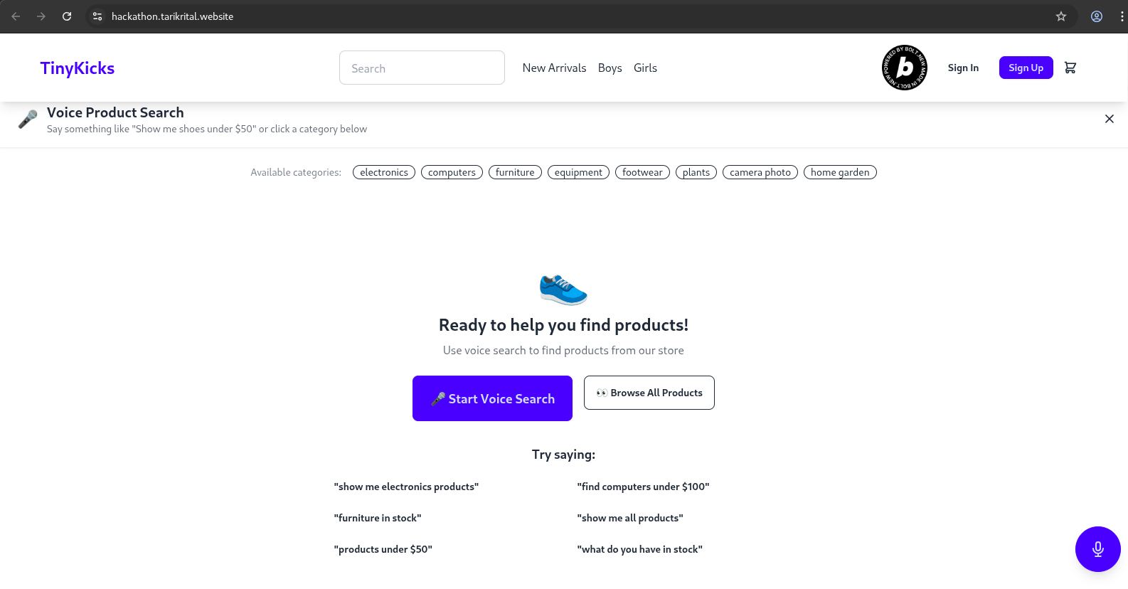 TinyKicks is an innovative e-commerce platform that combines modern web technologies with AI-powered voice search to create a seamless shopping experience. Built for the Bolt.new Hackathon, this project demonstrates the future of conversational commerce.