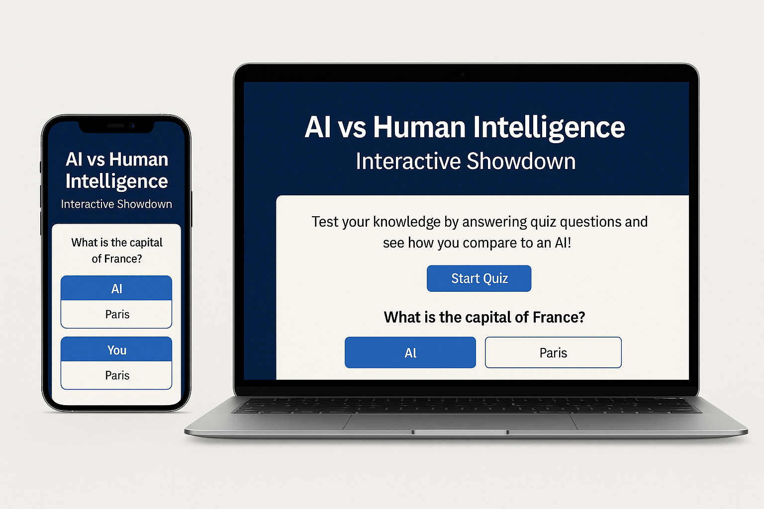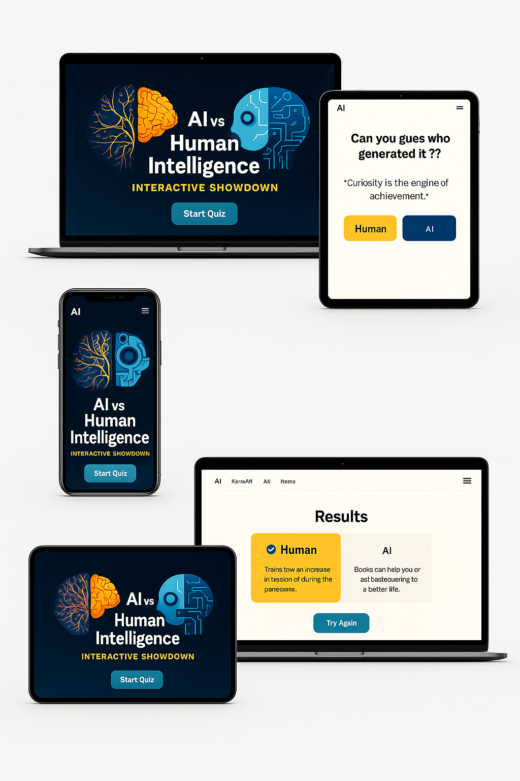 Responsive mockup of the AI vs Human Intelligence quiz website displayed on various devices, showcasing modern UI design.