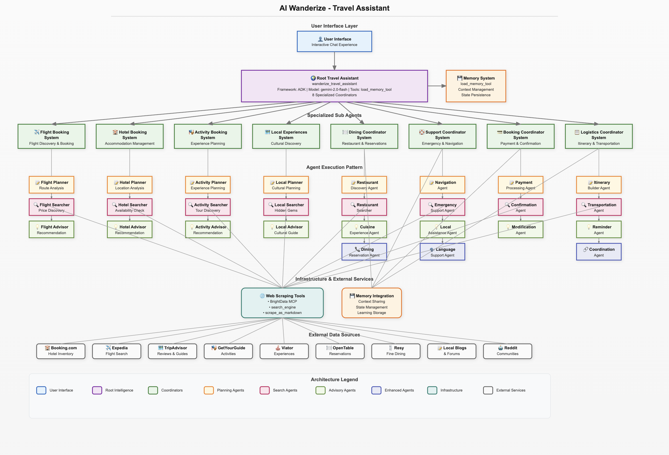 AI Wanderize is built on Google's Agent Development Kit (ADK), leveraging a sophisticated multi-agent architecture: