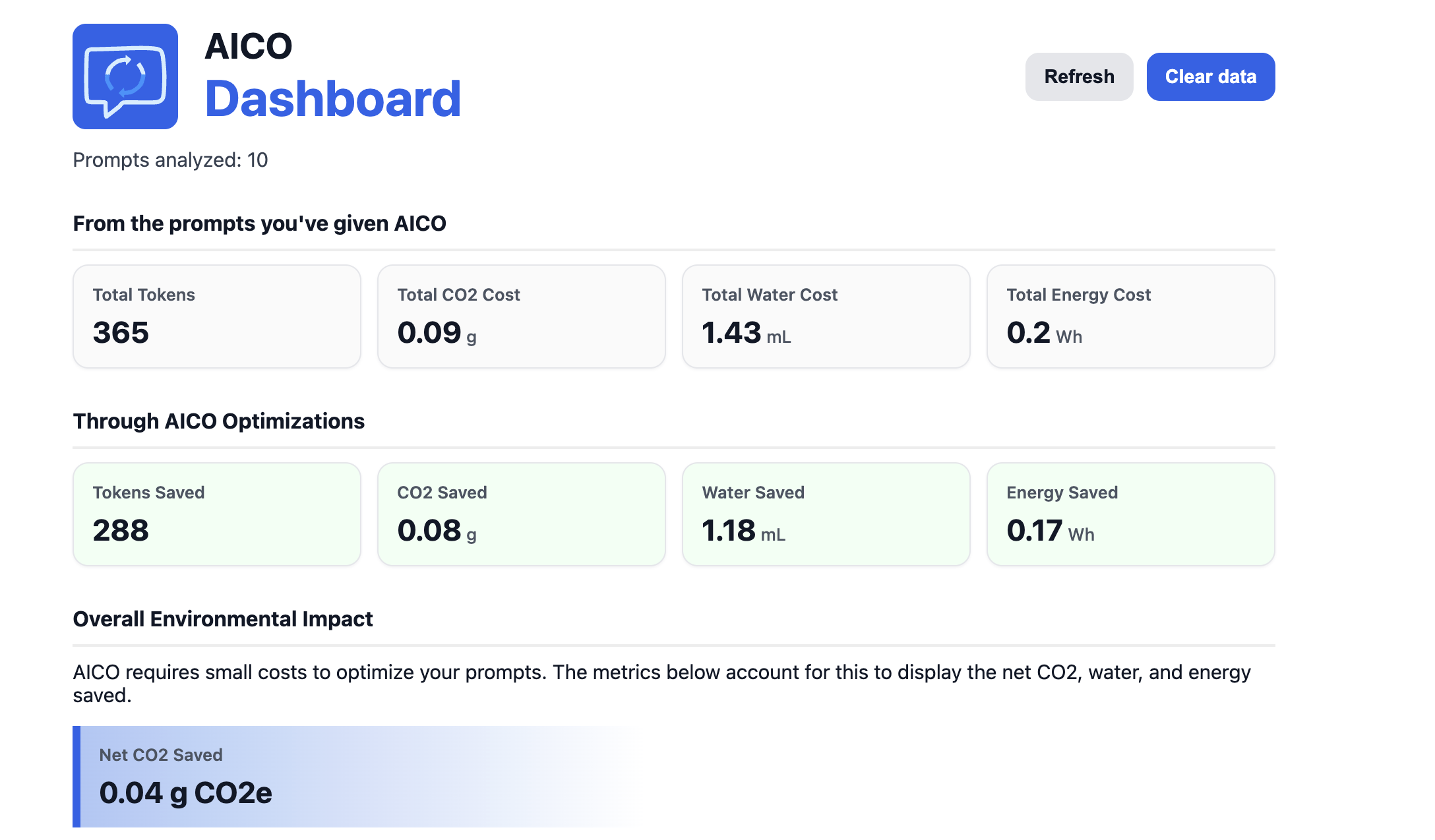 How we built it AICO is a Manifest V3 Chrome extension built with React, TypeScript, and Vite, bundled using the CRXJS plugin. The prompt analysis engine uses compromise for NLP (filler and vagueness detection, part-of-speech tagging) and js-tiktoken for accurate OpenAI-compatible token counting. Environmental and cost metrics are calculated per-model using sourced benchmarks from carbon-llm.com and industry estimates. The Gemini API handles optimization. Chrome's local and sync storage APIs persist history and user preferences across sessions. Recharts powers the dashboard visualizations.