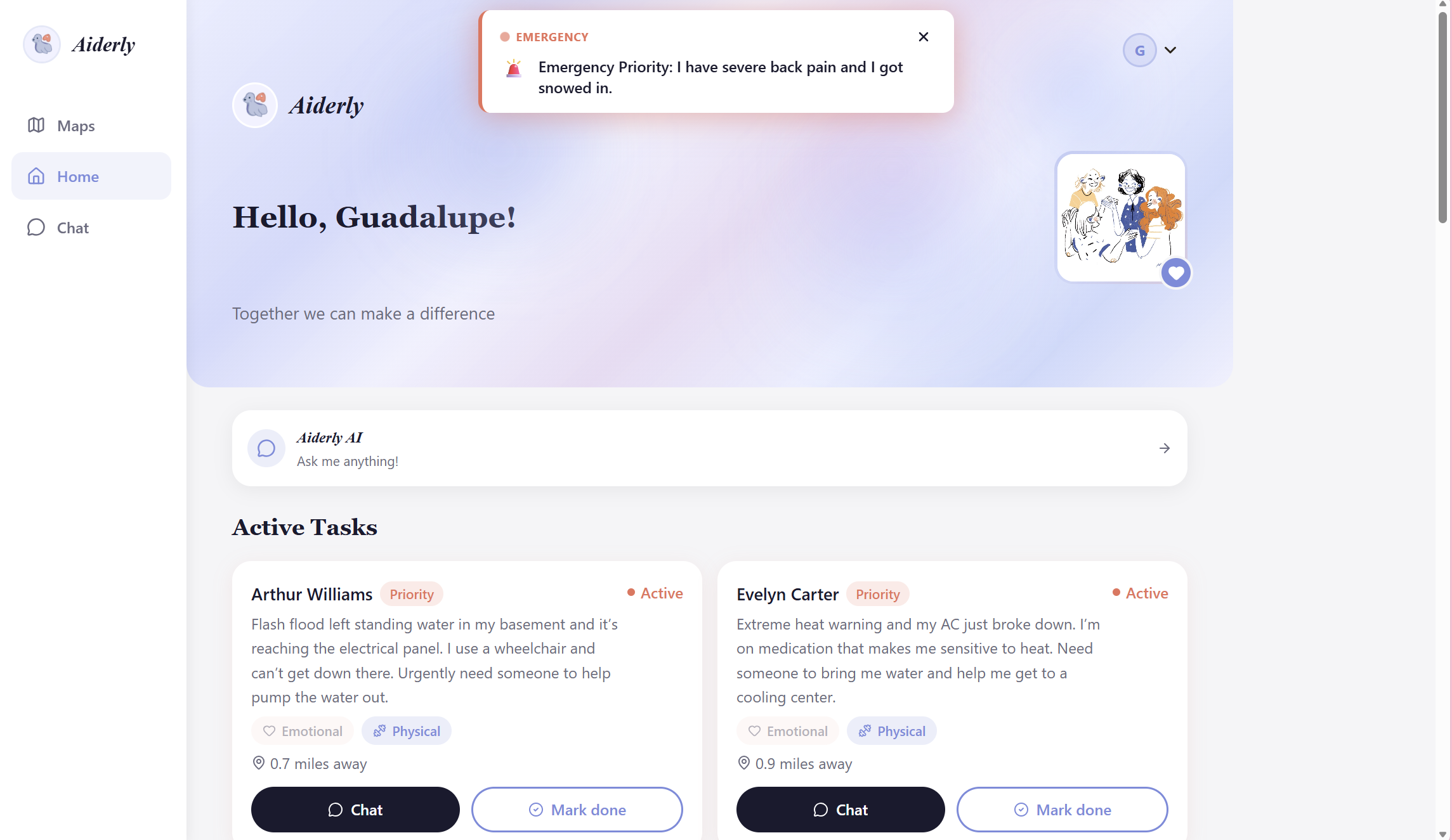 Aiderly matches local volunteers with the elderly who need assistance, whether it is attending to emergency falls or running grocery errands.