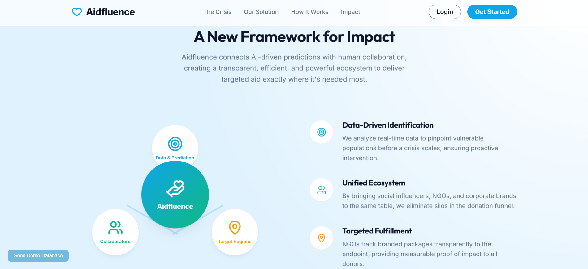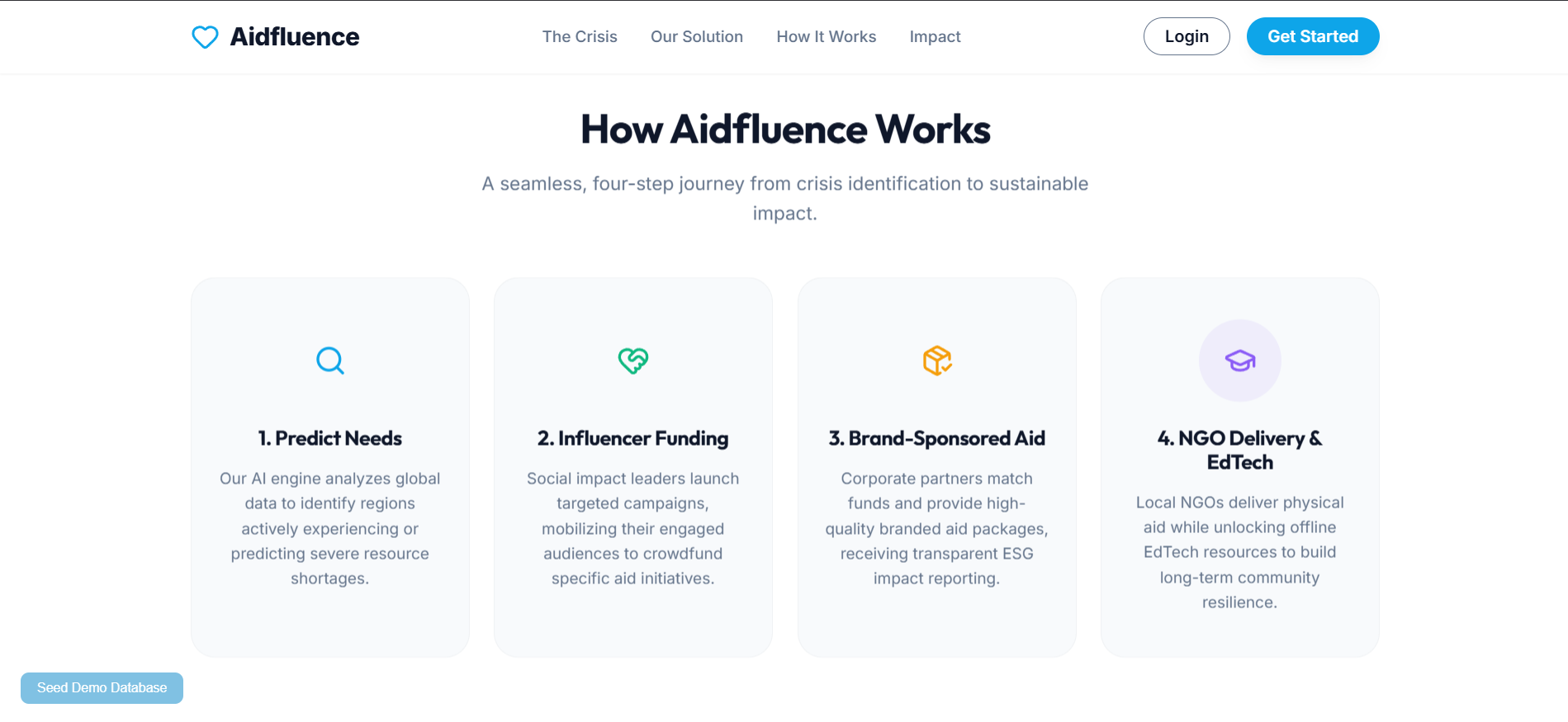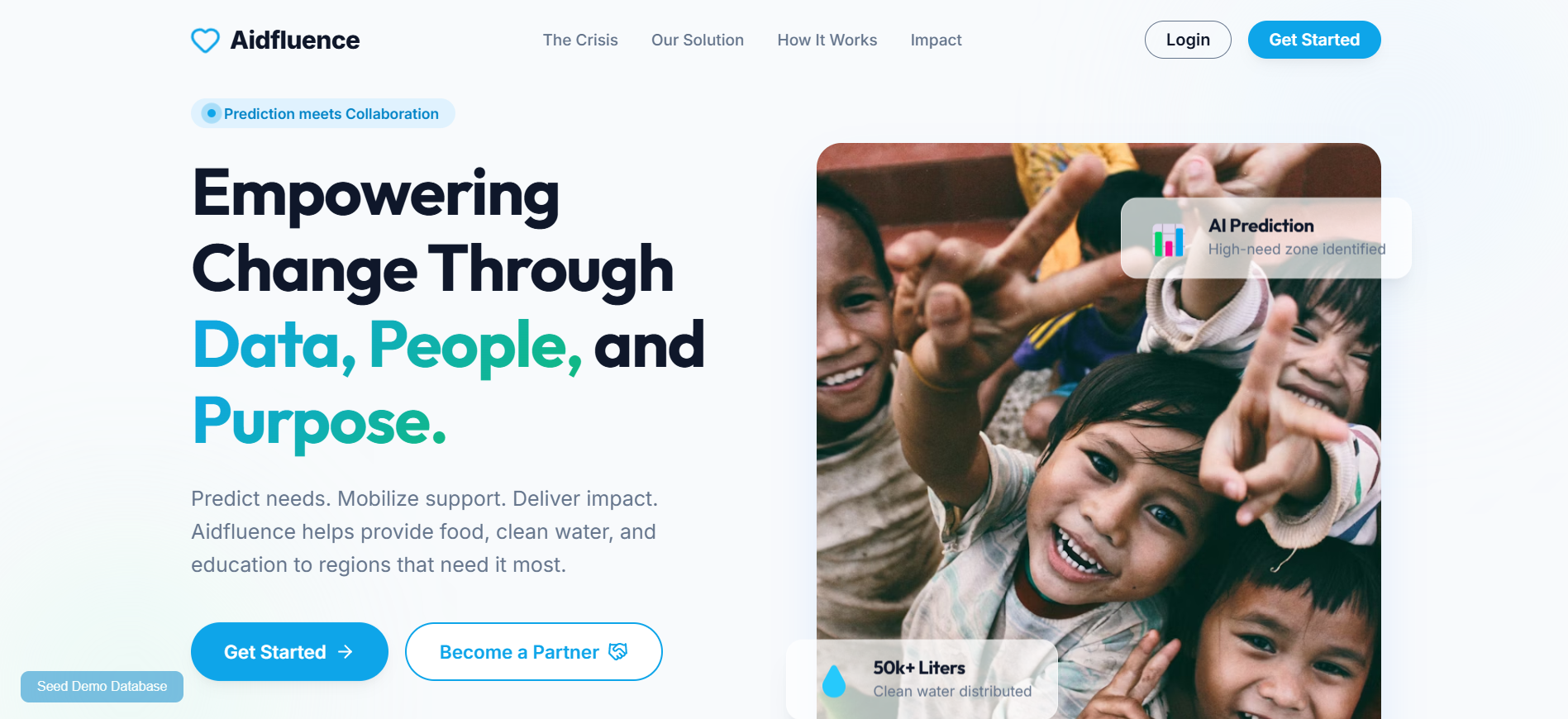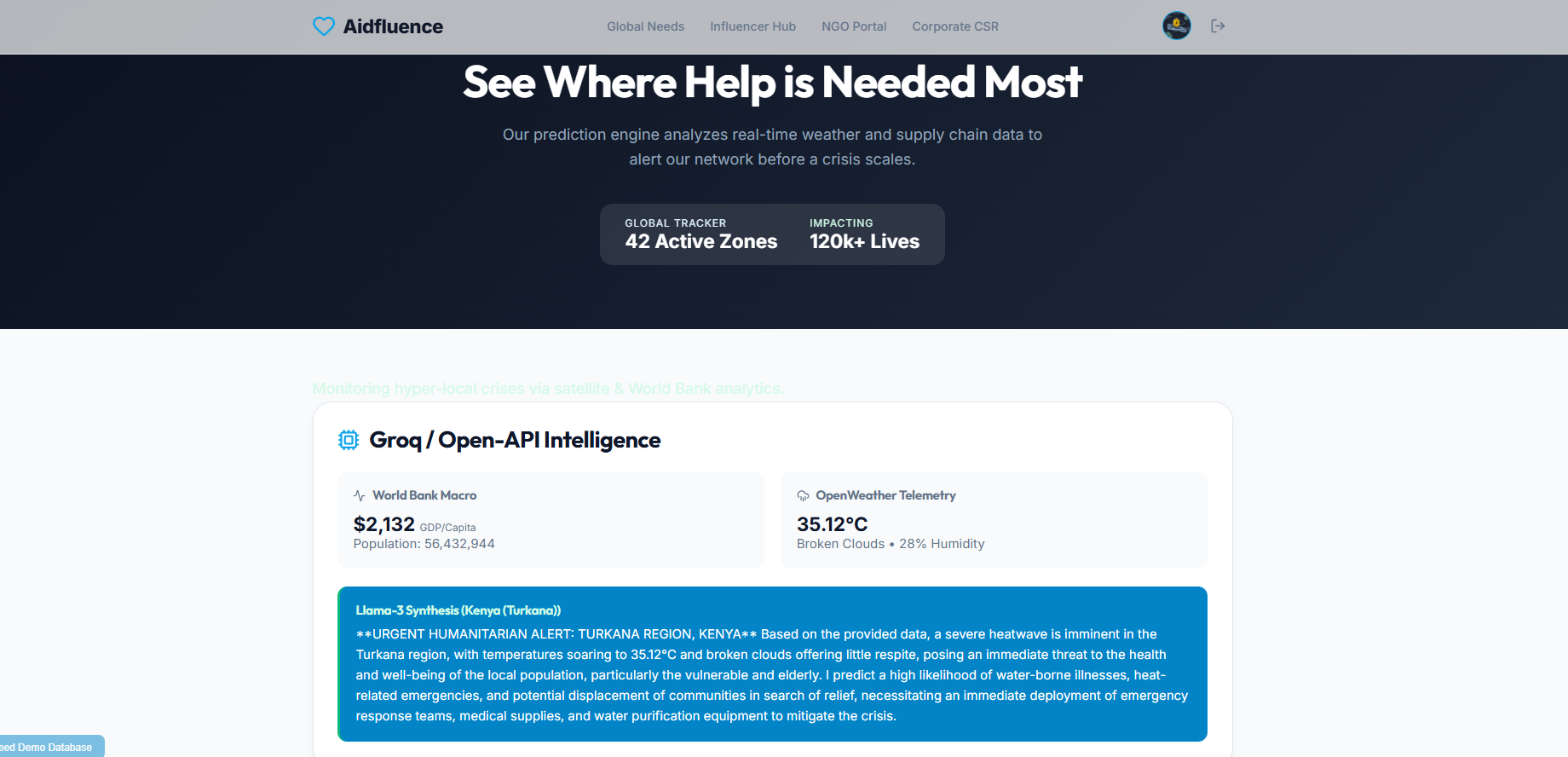 Aidfluence is a platform that predicts areas of highest need and mobilizes support efficiently. By leveraging AI-driven insights, it identifies high-need zones and connects them with organizations, donors, and partners who can help. The goal is to ensure that aid—whether it’s clean water, food, or education—reaches the right people at the right time, maximizing impact.
