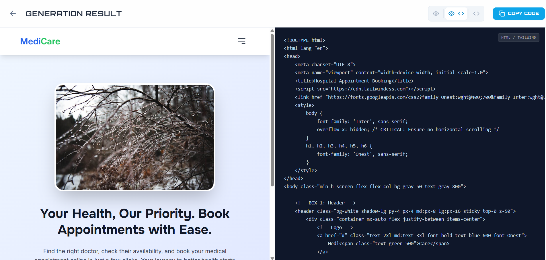 Gemini 3 analyzes the spatial layout of the boxes in the image and mimics it structurally, while applying the styling rules from the voice command to generate production-ready HTML + Tailwind CSS code.