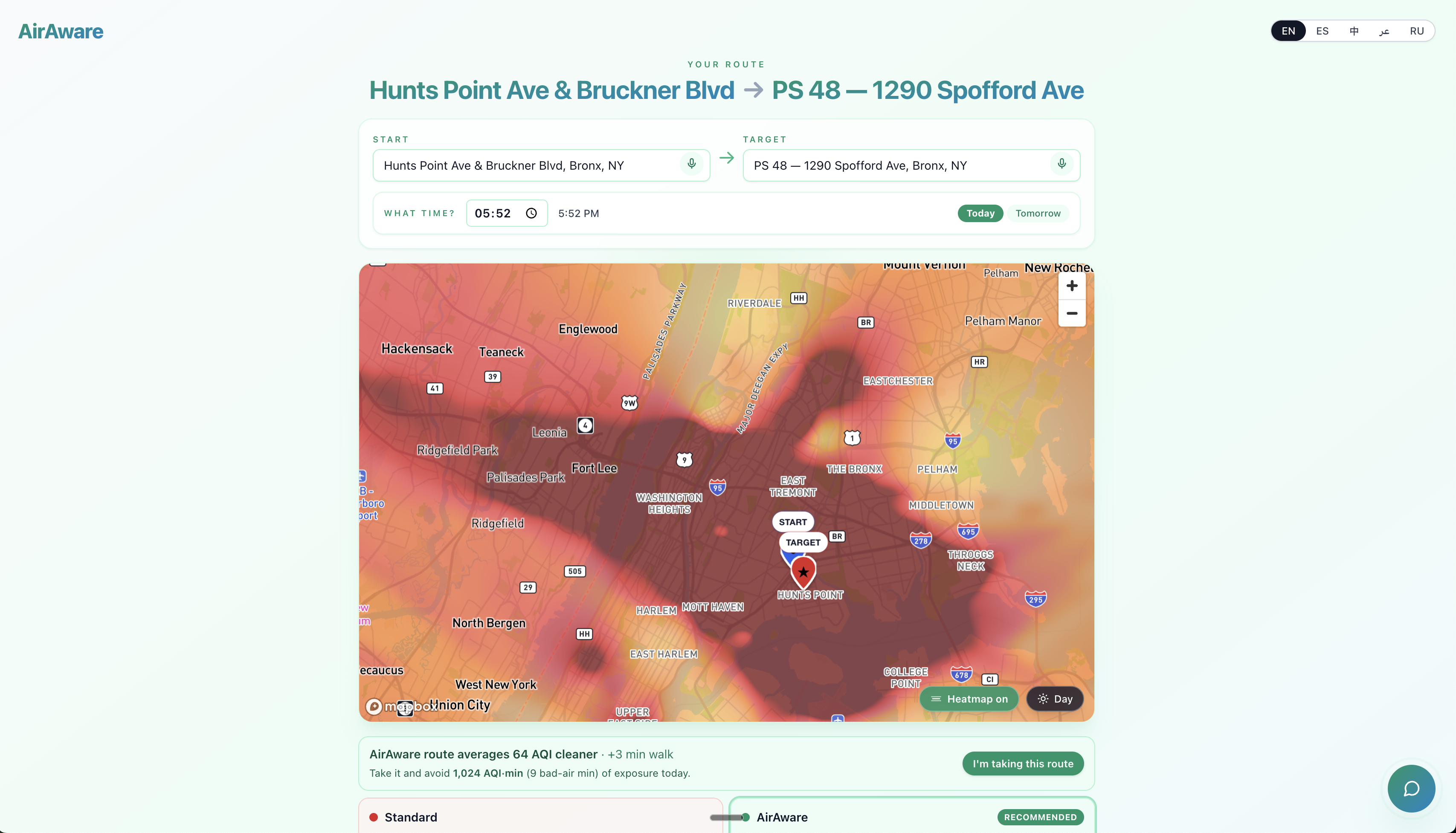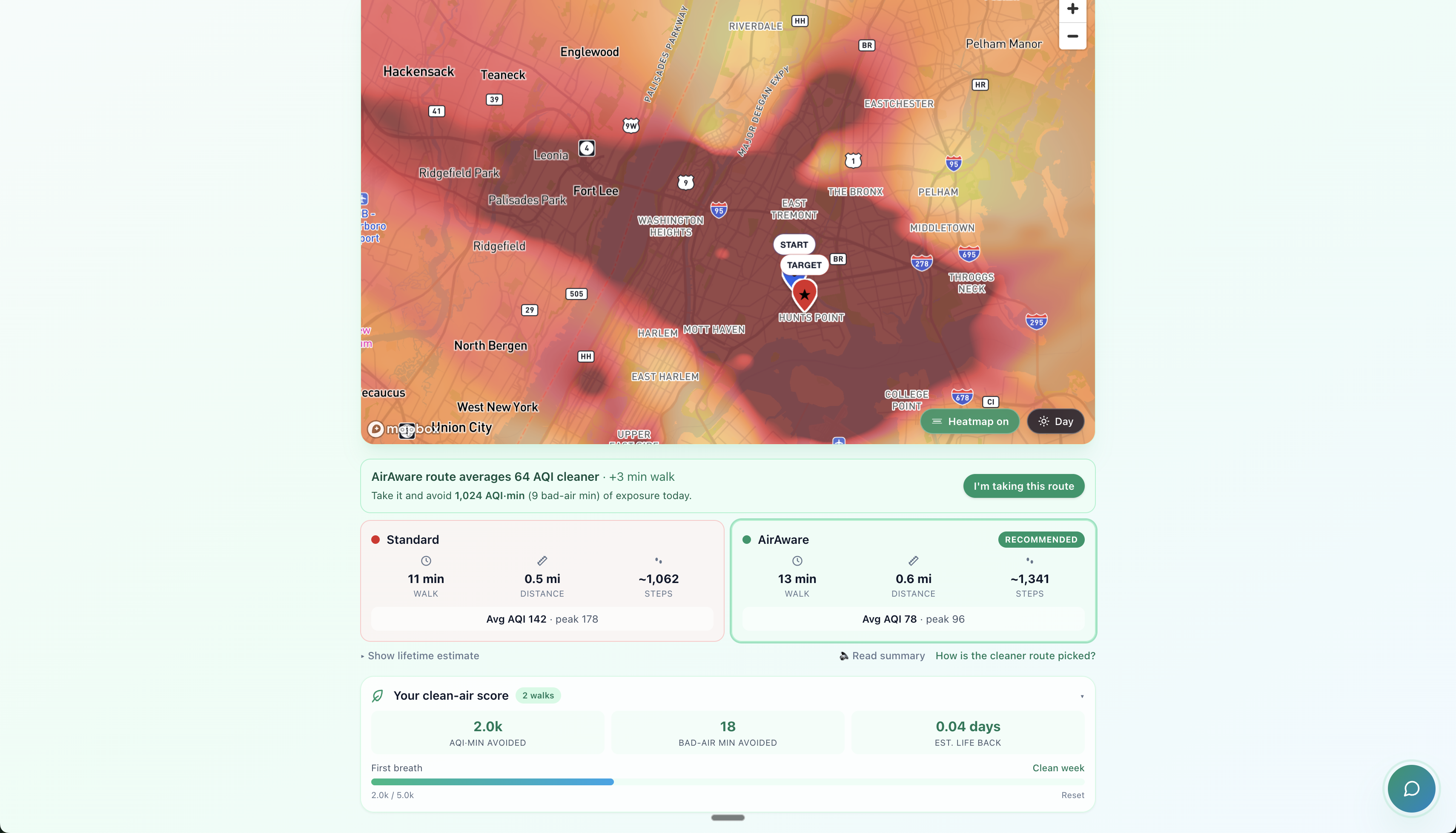 AirAware lets a NYC parent type two addresses (home + school, home + park, anywhere) and see two walking routes side-by-side: the standard fastest route in red, and an AQI-aware "Atlas" route in green that re-routes around high-pollution corridors like bus depots and elevated highways.