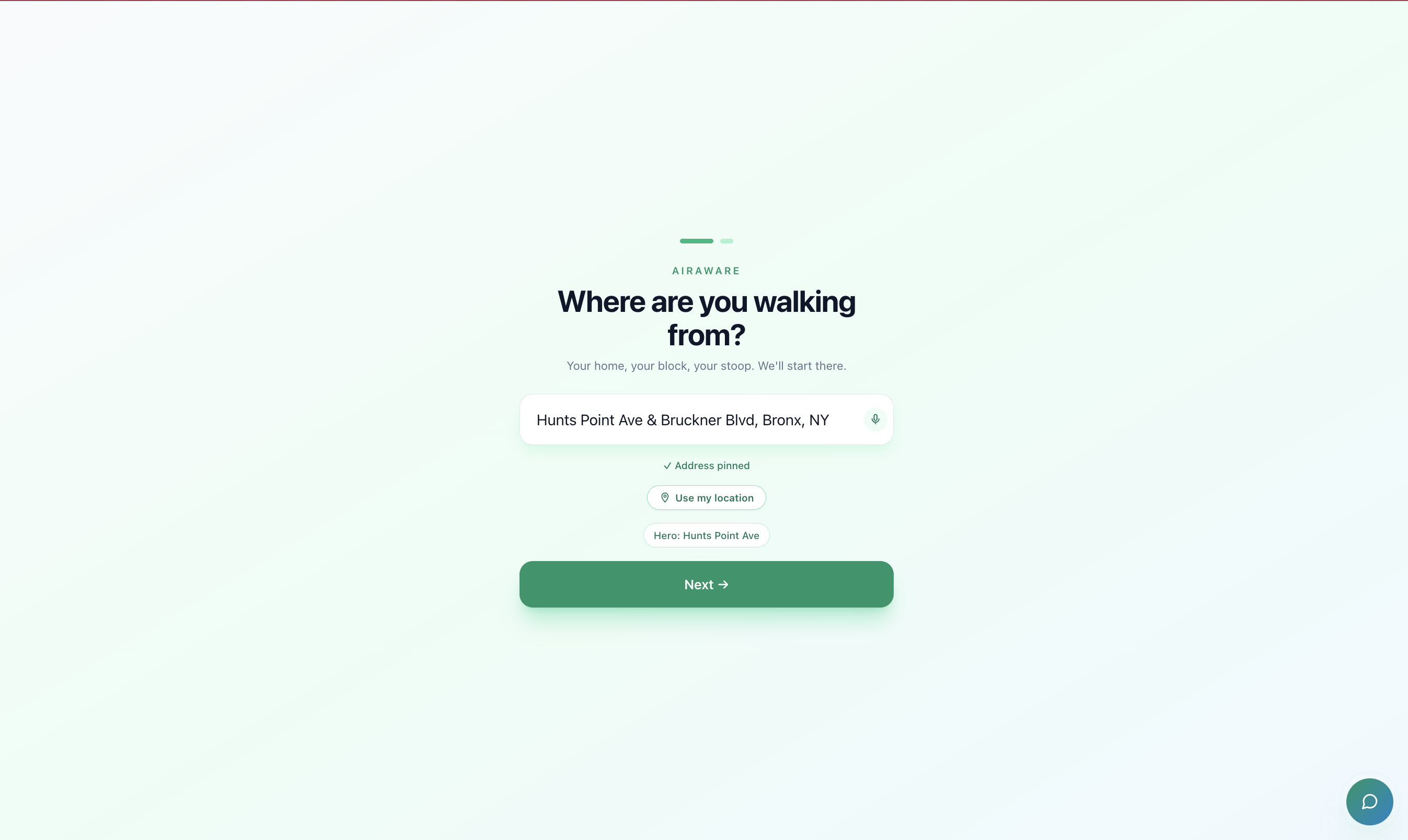 The hero address straddles two ZIP codes. The Hunts Point Ave & Bruckner Blvd intersection sits on the 10454/10474 boundary. Mapbox geocodes it to 10474, but the storyteller's stoop is on the 10454 (Mott Haven) side, which is the ZCTA the pitch's "1 in 24" beat depends on. We routed this disambiguation through a single override function in the block-context lookup — documented inline.