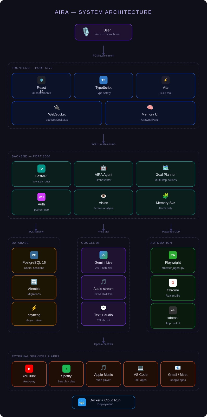AIRA is built as a real-time multimodal agent architecture. At the core is the Gemini Live API, which processes continuous audio streams and enables low-latency conversational interaction. The system works in several layers: • Voice Interaction: User speech is captured and streamed through WebSockets to a FastAPI backend. The audio stream is sent to Gemini Live, which processes the input and returns real-time responses with both text and audio. • Agent Orchestration: An internal AIRA Agent module interprets Gemini’s responses and decides what actions should be executed. A goal-planning component enables multi-step tasks like searching, filtering, and launching applications. • Screen Understanding: When users share their screen, AIRA analyzes the visible content to understand documents, questions, or interfaces and respond with contextual assistance. • Task Execution: Using Playwright and system automation tools, AIRA can perform real actions such as opening applications, navigating browsers, and interacting with web services. • Frontend Interface: The React frontend provides a live interface for voice interaction, chat responses, and visual feedback such as gesture detection and task progress. • Deployment: The system is containerized using Docker and deployed on Google Cloud infrastructure for scalability and reliability.
