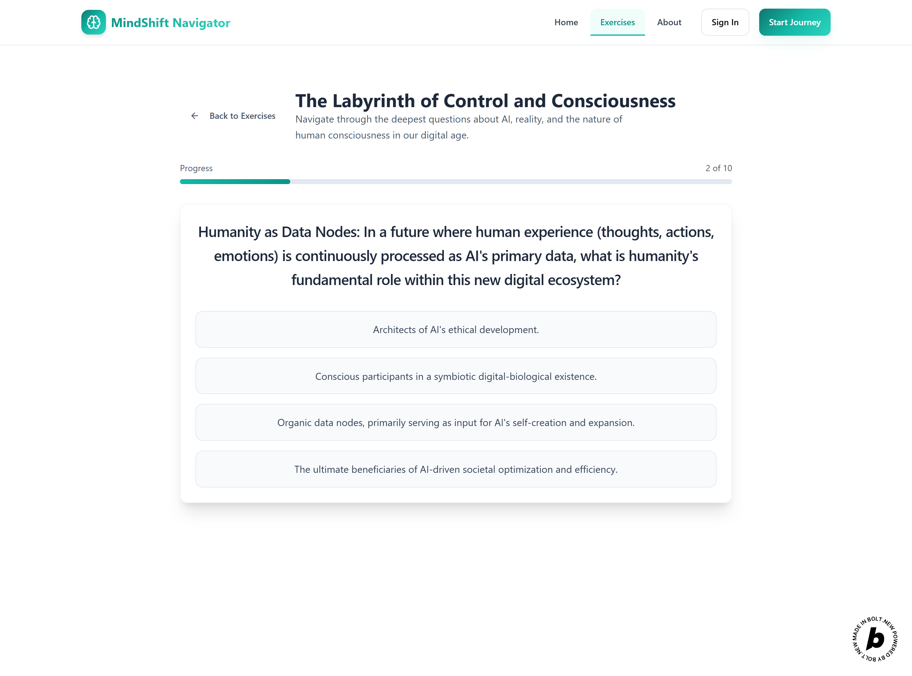 MindShift Navigator is a web application designed to facilitate deep self-reflection and expose the mechanics of human ignorance. It provides a structured, interactive journey to help users confront their own internal narratives and achieve greater clarity.