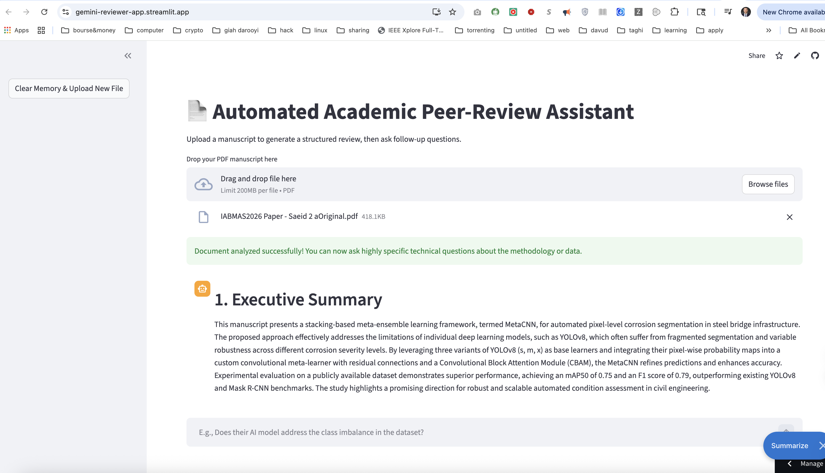 💡 Inspiration: As a Graduate student in Structural Engineering at the University of Kansas and an active peer reviewer for high-impact journals like ESWA, I have lived the "peer-review bottleneck" firsthand. Evaluating a dense, 30-page manuscript—filled with complex sensor data, deep learning architectures, and structural mechanics—takes hours of intense cognitive labor.I realized that while researchers are producing data faster than ever, the human-in-the-loop verification process hasn't changed in decades. I was inspired to see if I could leverage the Gemini API's massive context window to act as a "co-pilot" for experts, ensuring that no methodological flaw goes unnoticed and that scientific progress isn't delayed by administrative fatigue.🤖 What it does: AIReviewer is a specialized academic co-pilot designed to transform how technical research is validated. It doesn't just "read" text; it "interrogates" manuscripts. Key capabilities include:Automated Methodological Audits: Instantly cross-referencing proposed methods against established scientific frameworks.Native PDF Synthesis: Processing full engineering reports while maintaining the context of tables, diagrams, and formulas.Interactive Peer Review: A stateful chat interface where a reviewer can ask specific, high-level questions like, "Is the sampling frequency in this structural vibration test sufficient for the Nyquist criterion?"🛠️ How I built it: The application is built using a modern, secure Python stack:Core Engine: I integrated Gemini 2.0 Flash via the google-generativeai SDK. I chose the Flash model for its incredible speed and its 1M+ token context window, which is essential for long-form academic papers.Interface: Streamlit was used to build a responsive, stateful dashboard for document interaction.Native File Processing: I utilized the Gemini File API to enable native PDF understanding, avoiding the data loss typically seen with standard OCR or text extraction tools.Mathematical Precision: The system is designed to parse and evaluate complex equations. For example, when evaluating fracture mechanics research, the model can verify the logic behind the Stress Intensity Factor:$$K_I = Y \sigma \sqrt{\pi a}$$🚀 Challenges I ran into: The journey wasn't without its technical hurdles:Environment Isolation: Developing on macOS meant navigating "externally managed environment" restrictions. I overcame this by implementing a robust virtual environment (venv) strategy.Credential Security: To ensure the Gemini API key was never compromised, I utilized Streamlit’s secrets.toml architecture, keeping the "key" out of the source code and GitHub.Prompt Alignment: Getting an LLM to think like a "Senior Journal Editor" required rigorous prompt engineering to ensure the output was critical and constructive rather than just a summary.🎉 Accomplishments that I'm proud of: Zero-Loss PDF Extraction: Successfully processing technical tables and LaTeX formulas without "hallucinations."Expert Persona: Achieving a level of critique that mirrors the feedback I provide in my professional capacity as a journal reviewer.Rapid Deployment: Going from a terminal command-line tool to a fully functional, cloud-ready web app within the hackathon timeline.🎓 What I learned: I learned that the true power of Gemini 2.0 lies in its Multimodality. By allowing the model to process files natively rather than just as strings of text, I unlocked a much higher level of reasoning for technical engineering data. I also learned that AI in academia isn't about replacement; it’s about augmentation—freeing up experts to focus on creative breakthroughs rather than clerical checking.🔮 What's next for AIReviewer: Blockchain Verification: Integrating with decentralized protocols to create an immutable record of peer-review contributions.Direct Journal Integration: Building plugins for manuscript management systems to assist editors in the initial screening phase.SHM Specialized Models: Fine-tuning the prompt logic specifically for Structural Health Monitoring to automatically detect sensor placement errors and data anomalies in real-time.