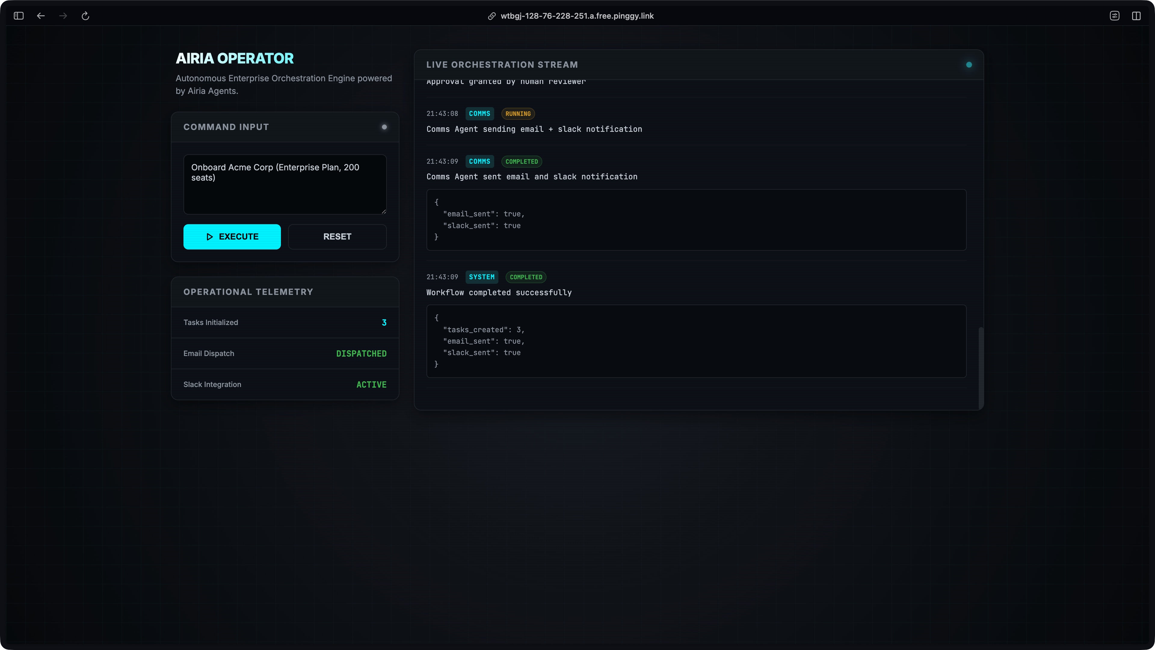 - Autonomous Agent Provisioning: Fully automated setup of specialized agents and their toolkits via the Airia API.