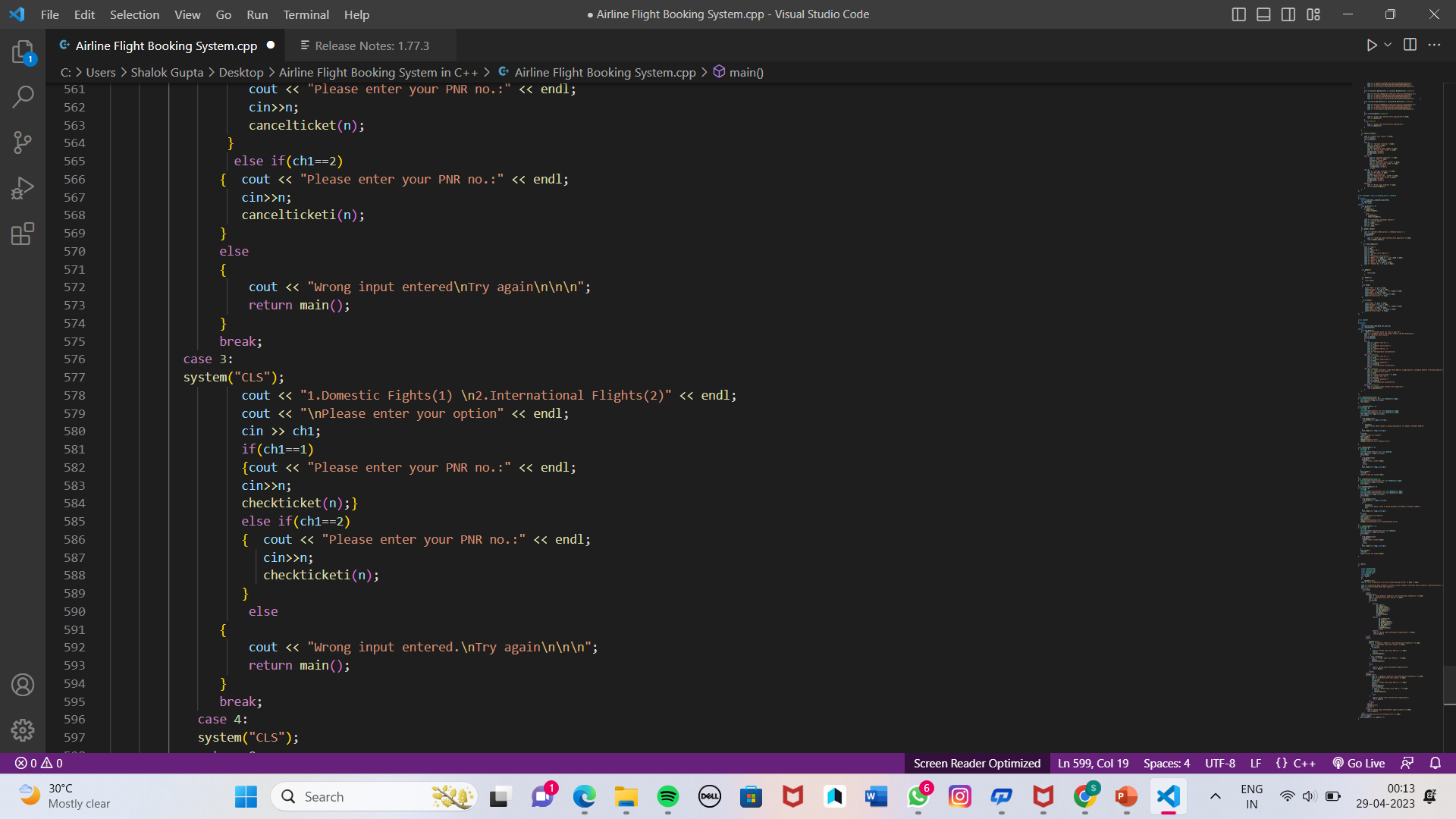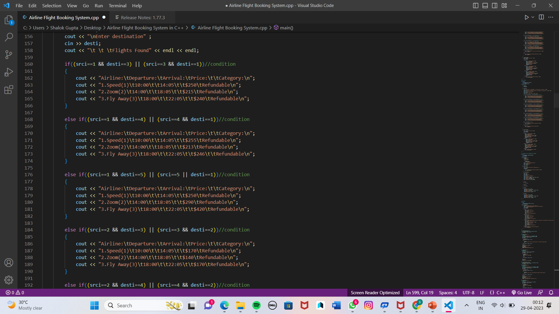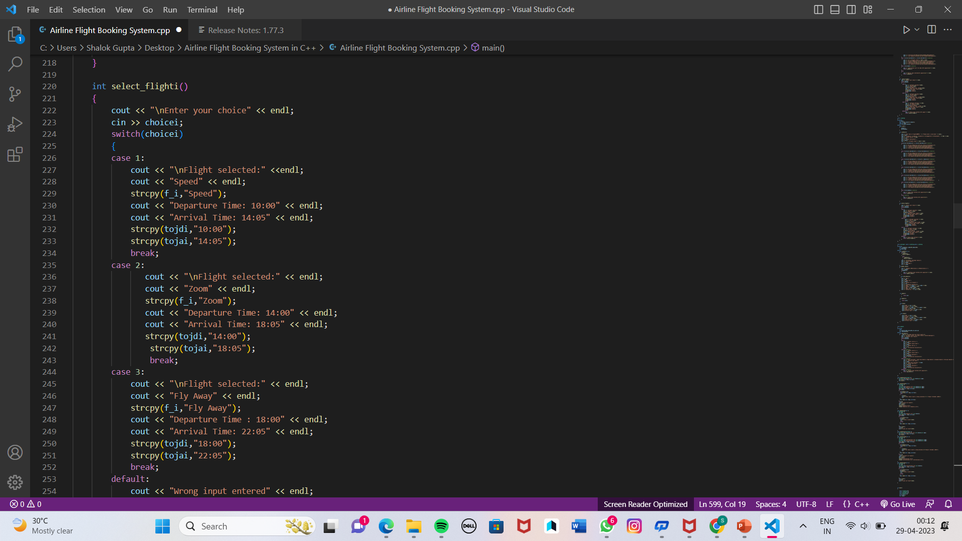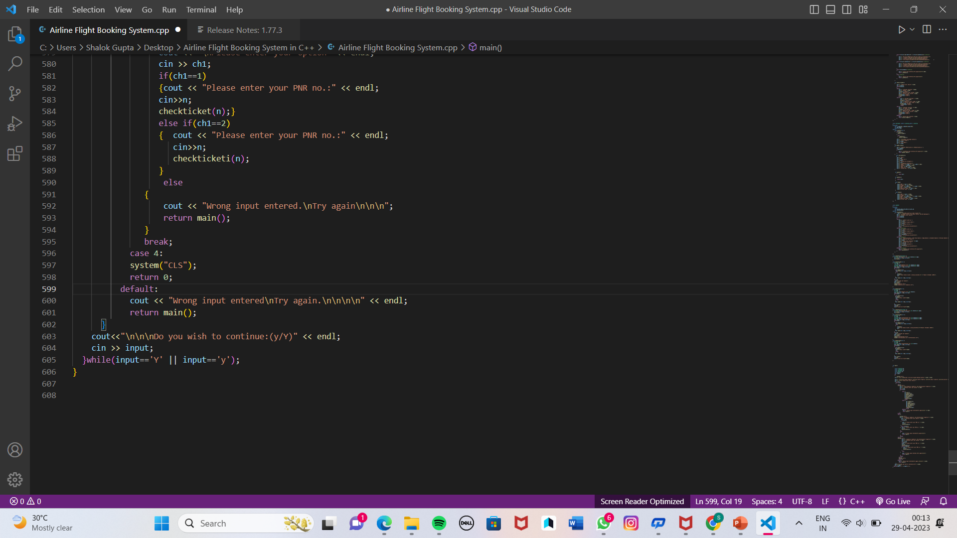 int main() { start : cout << "******************************************************************\n"; cout <<"..............Welcome to the Phenomenal Airline Services ............\n"; cout << "******************************************************************\n"; int k = 0; int choice; do { cout << "\tHit the Option of your Choice\n"; cout << "--------------------------------------------------------------------\n"; cout << "\t1. Booking\t\t2. Flight Details\n"; cout << "\t3. Search\t\t4. Modify\n"; cout << "\t5. Cancellation\t\t6. Passenger Details\n";