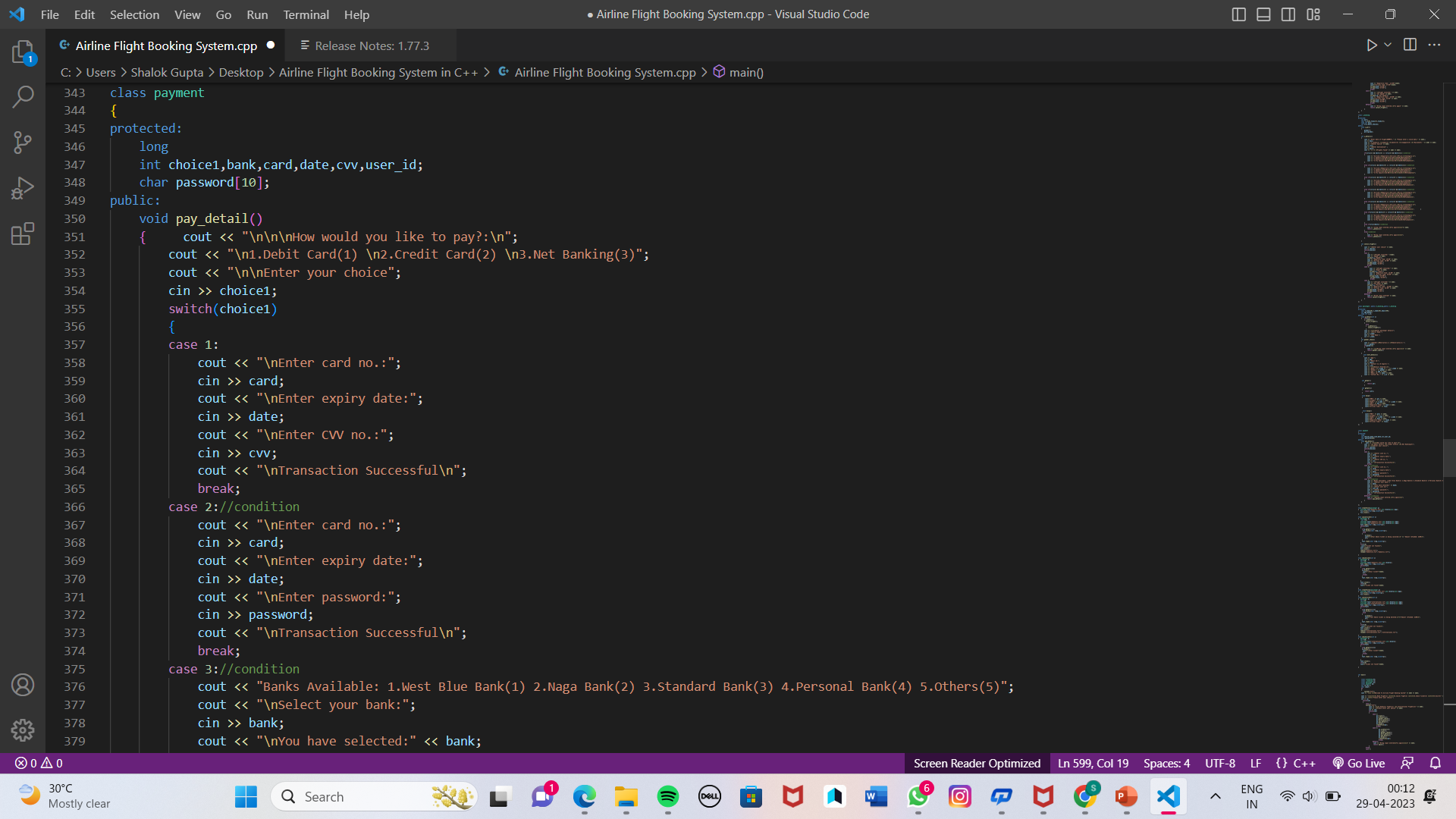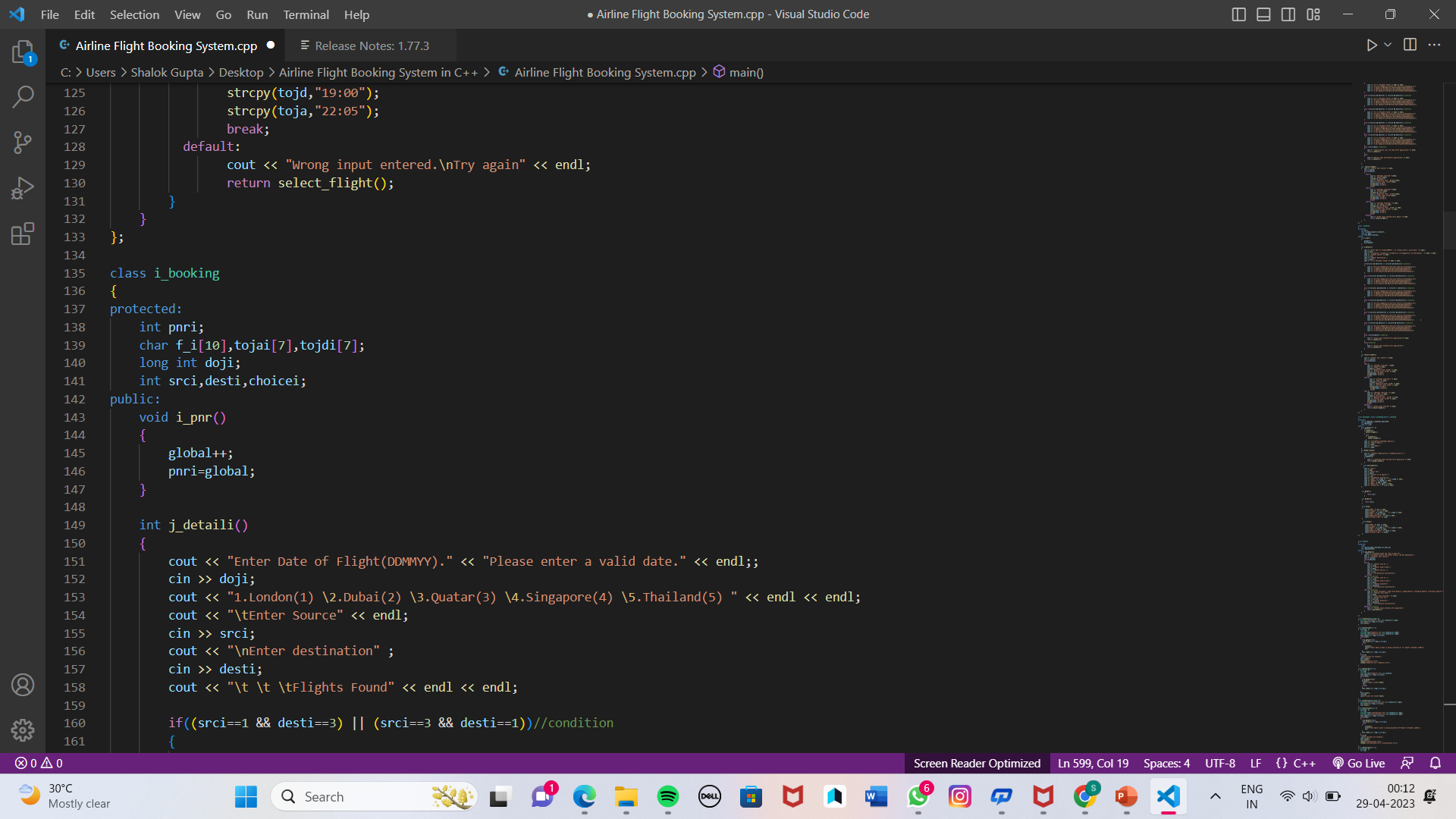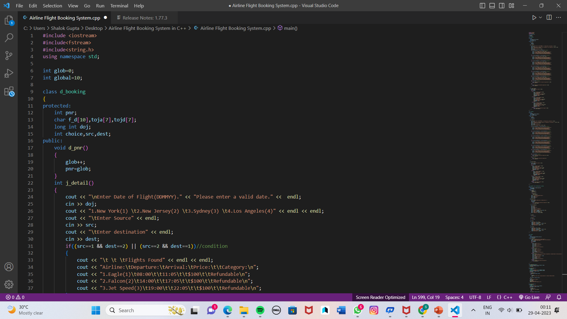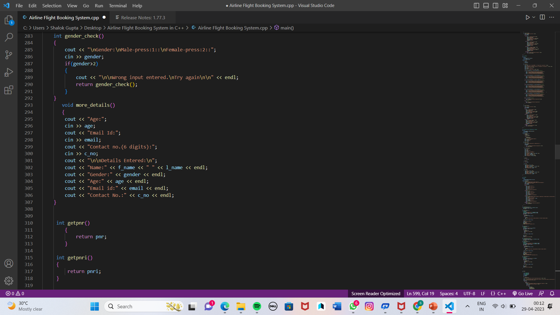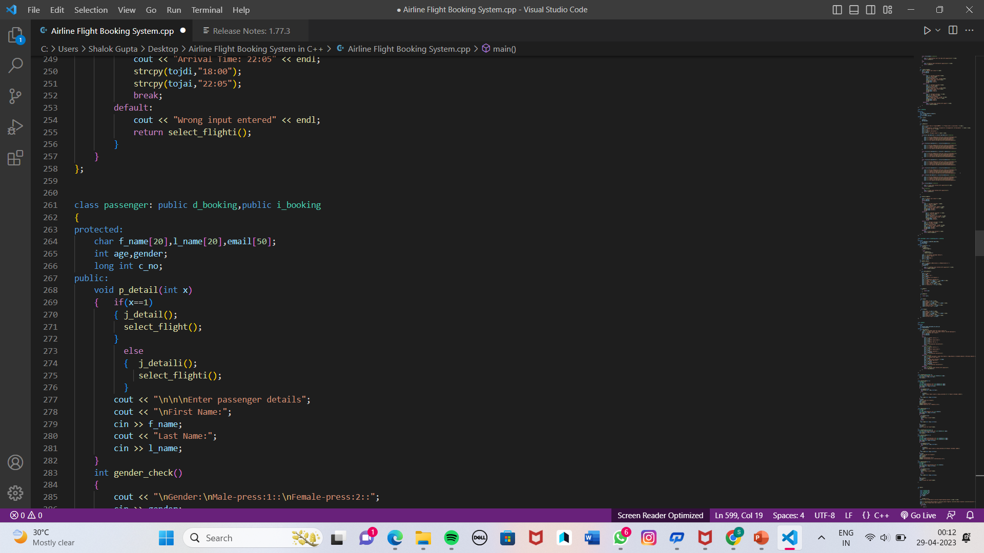 class BOOKING { public : char name[20]; char add[50]; char email[50]; long mobile; int age; char sex; char departure[25]; char arrival[25]; char date[10]; long long aadhar; public : int getInfo() { cout << "Enter Passenger's Name :- "; cin.get(); cin.getline(name,20);