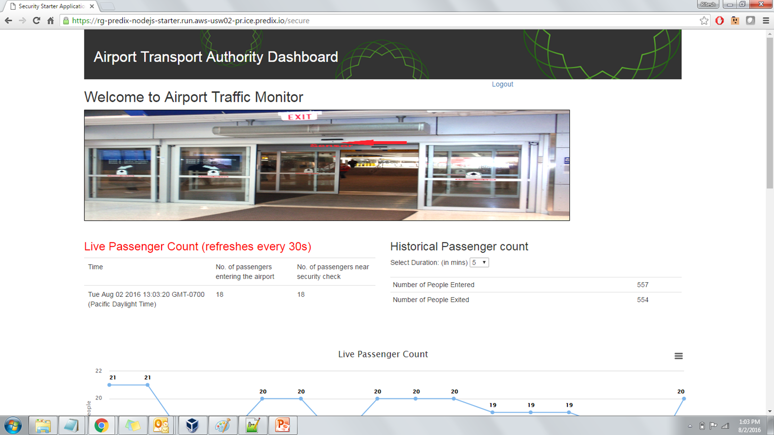 This is Airport Traffic Monitor, it counts passengers entering and exiting the airport using "Pedestrian Planning" smart service and using "Indoor positioning" smart service to capture how many people are near to the security checkpoint area. Following are the business values out of this application. 1) Open more TSA gates: If there is large crowd entering to the airport then airport security can be informed and they can prepare for extra crowd by having more staff and opening more TSA gates beforehand. As soon as system see that the crowd inflow is upper than a threshold value then security team can be alerted. This will help in reducing wait times at the security lines.