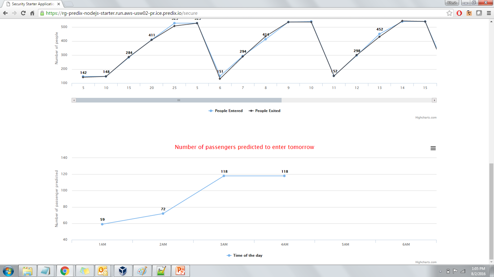 Application is showing following 3 statistics: 1) Live passenger count 2) Historical passenger count by showing last 5, 10, 15..30 mins passenger count data. 3) By analyzing historical data by using logistic regression algorithm we can predict tomorrow traffic.