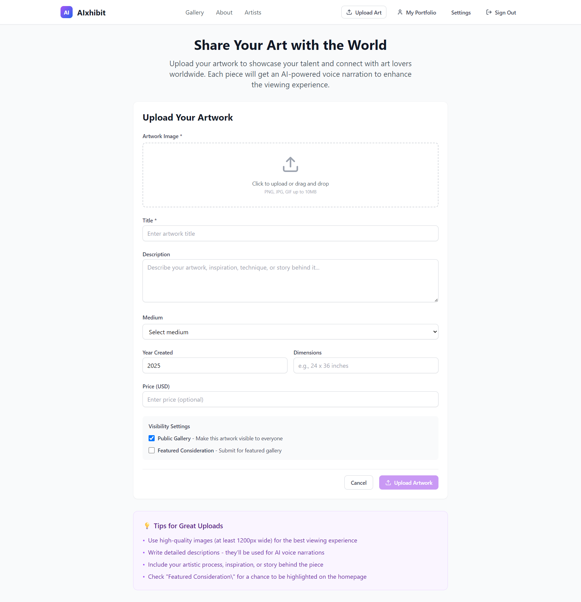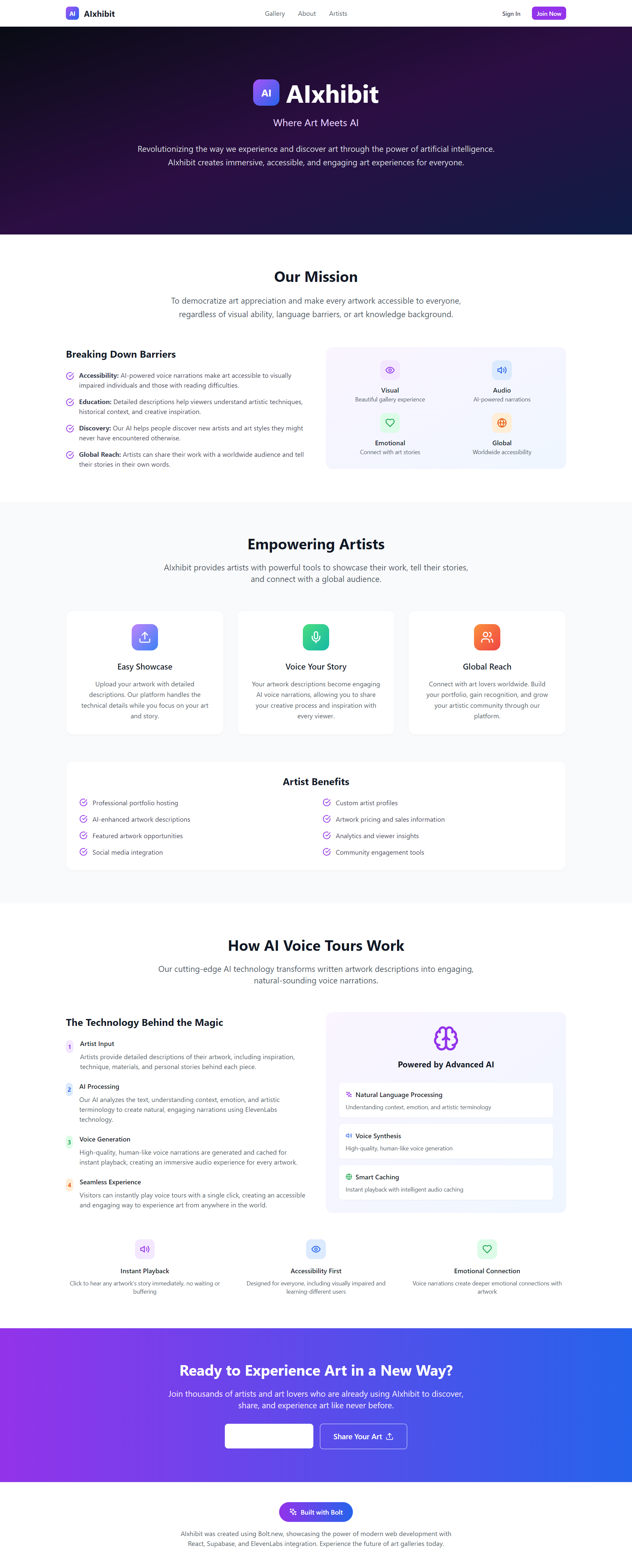 With the rise of generative AI and no-code tools like Bolt.new, we saw a unique opportunity to give every artist — from hobbyists to professionals — a way to elegantly showcase their work and tell their story through voice, without writing code or managing websites.